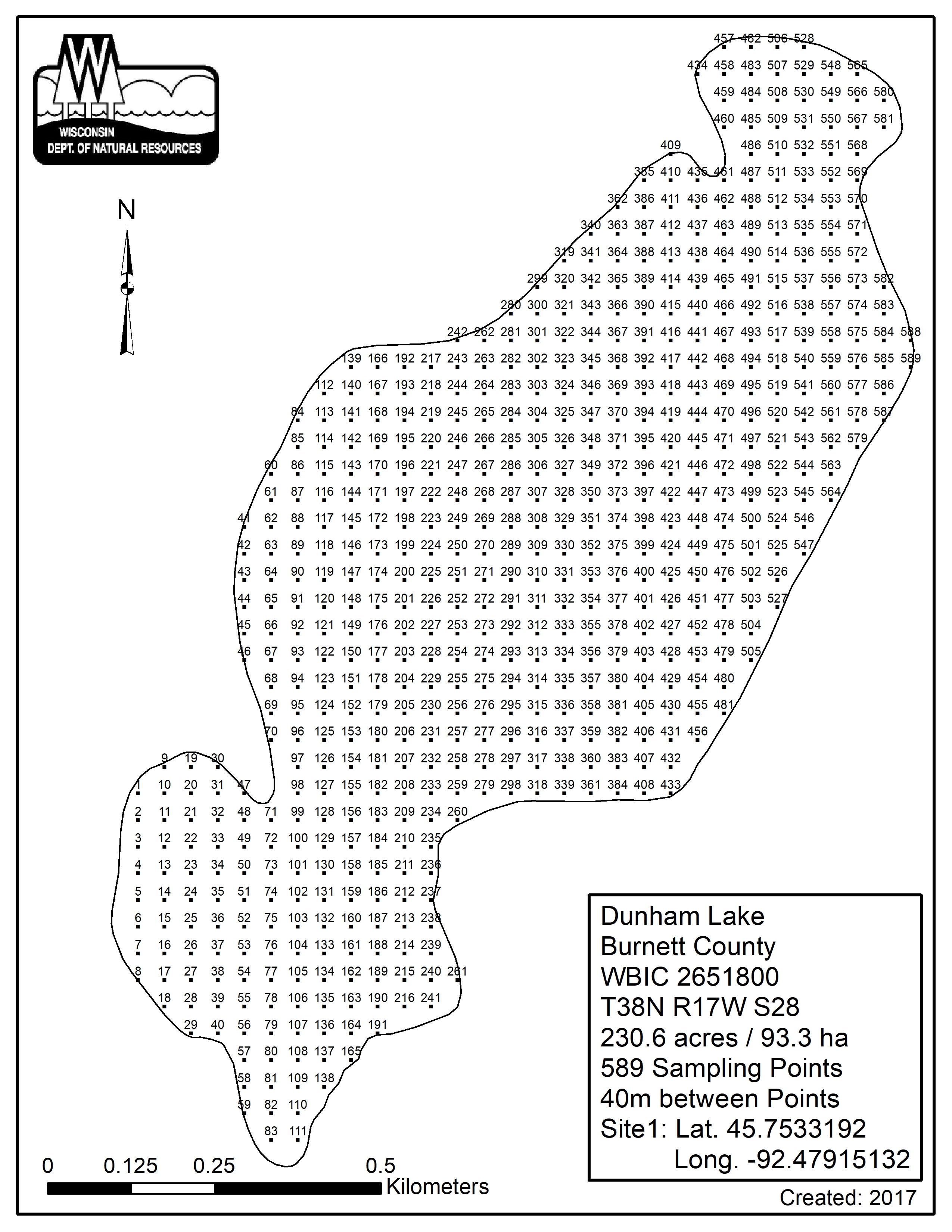 Dunham Lake, Burnett County - Aquatic Plant Sampling Map (40 mpts)