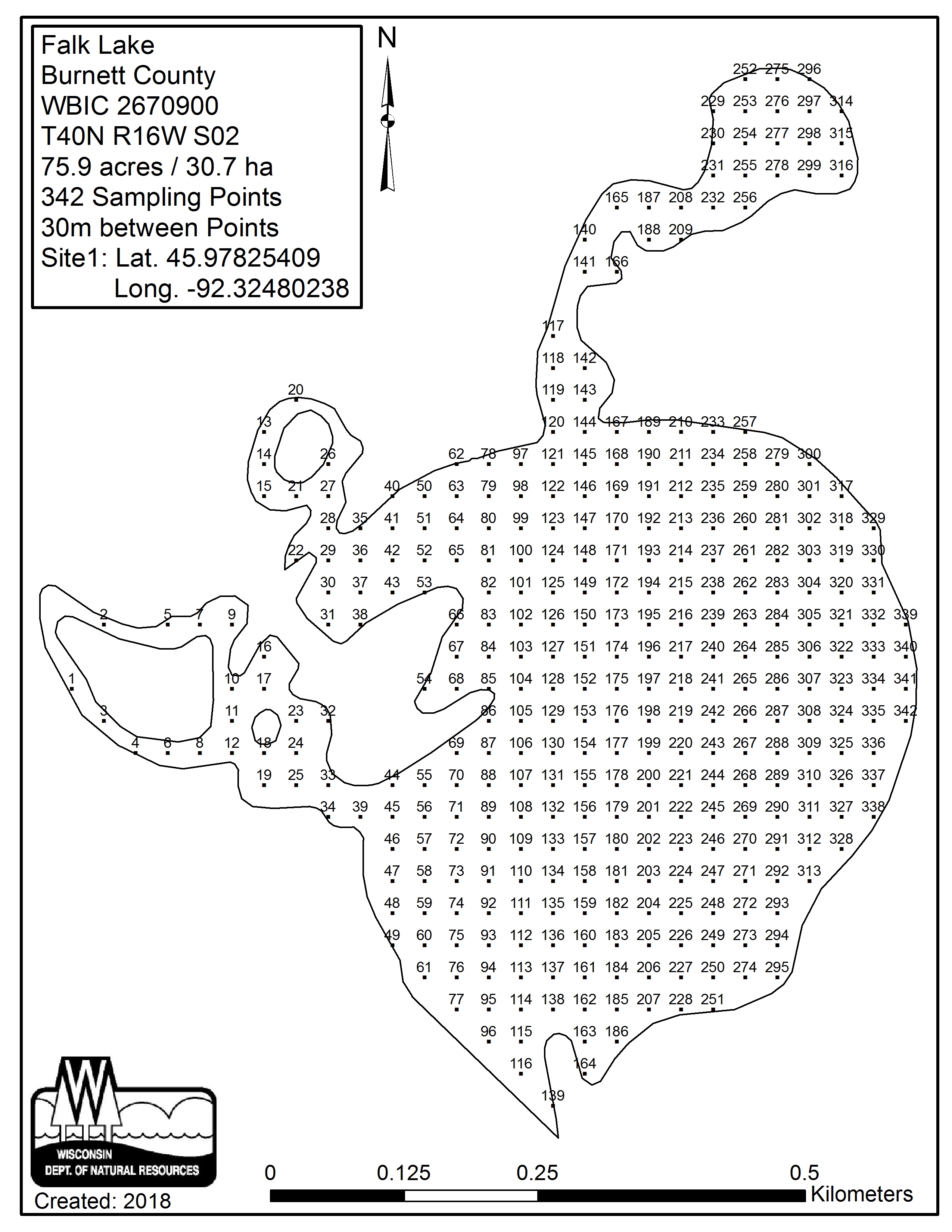 Falk Lake, Burnett County - Aquatic Plant Sampling Map (30 mpts)