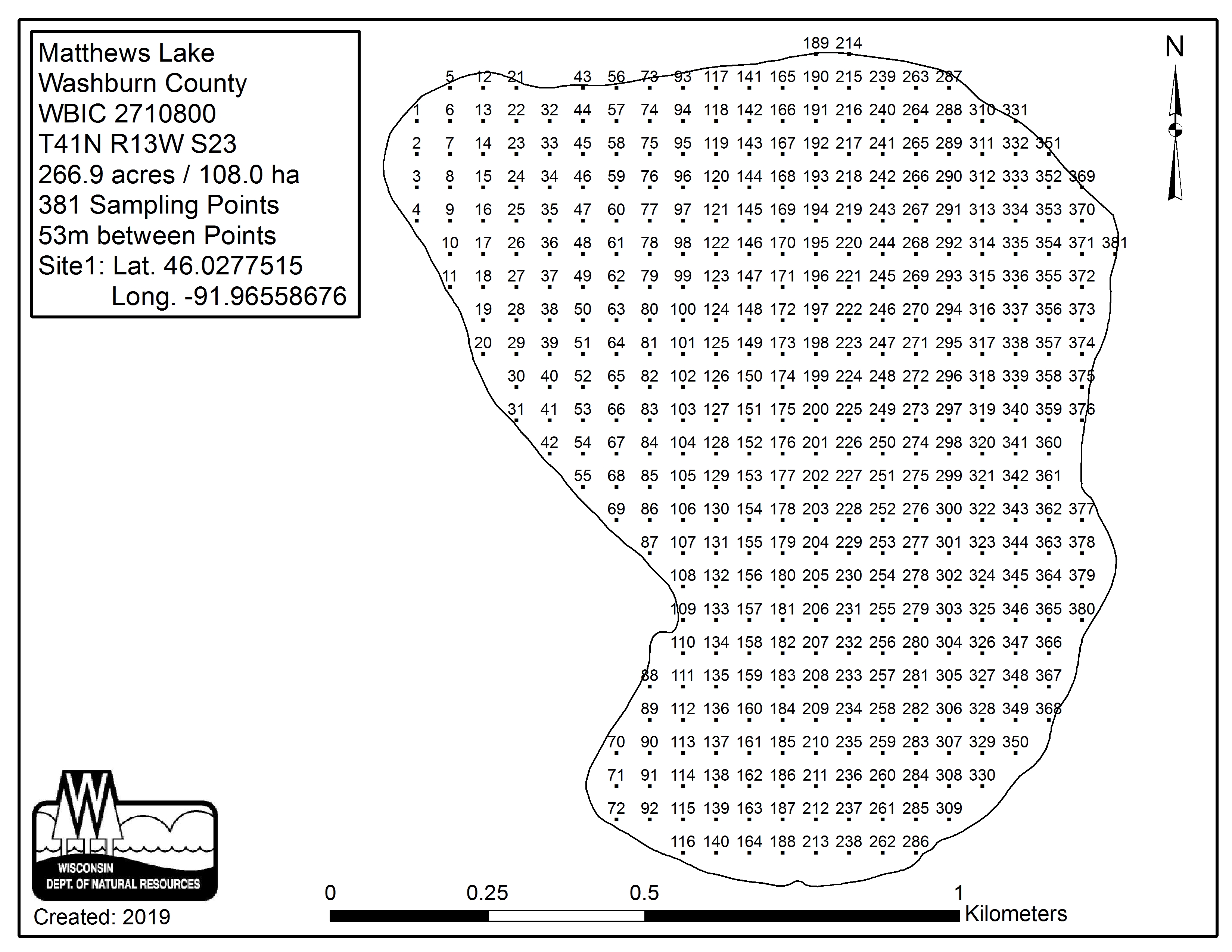 Matthews Lake, Washburn County - Aquatic Plant Sampling Map (53 mpts)