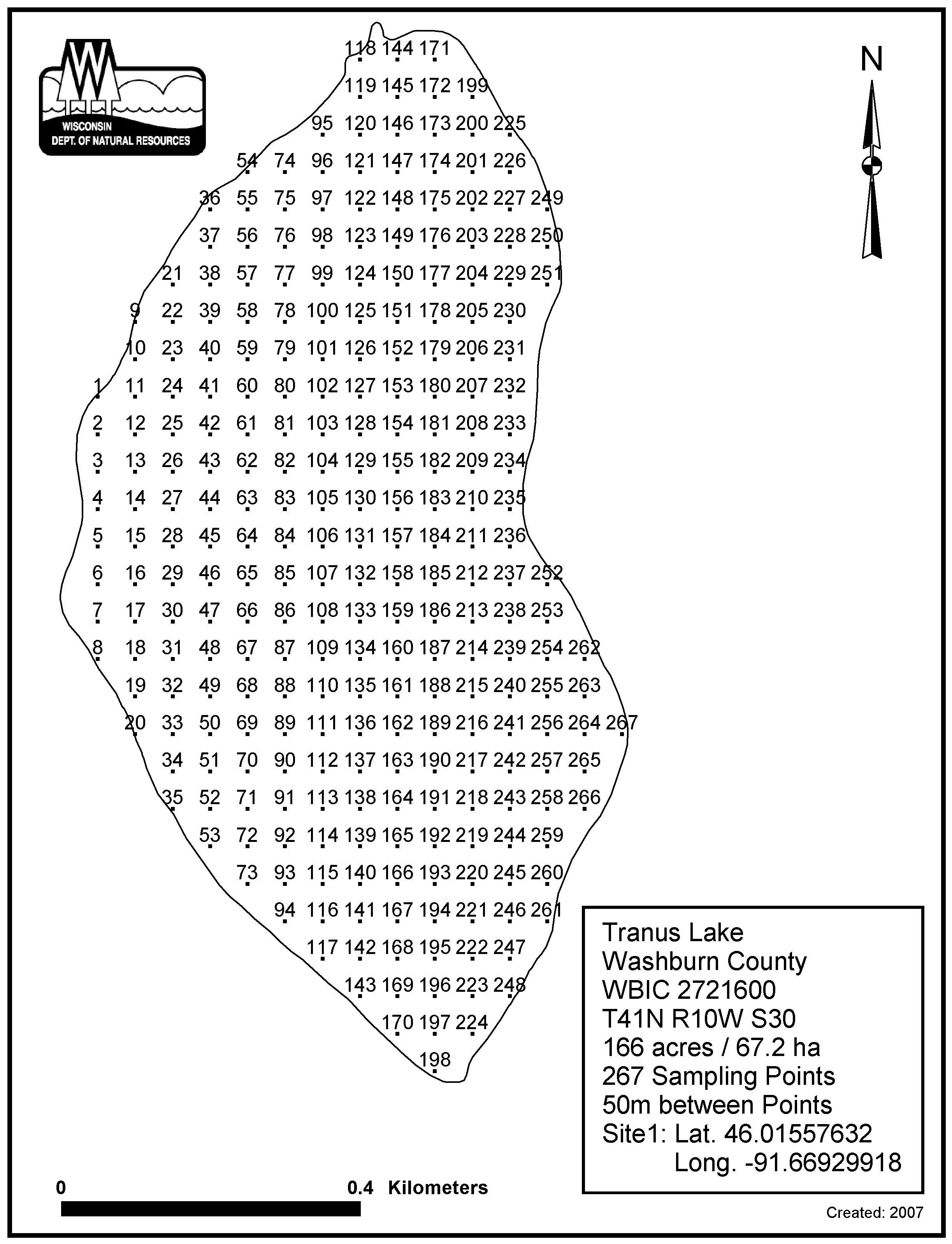 Tranus Lake, Washburn County - Aquatic Plant Sampling Map (50 mpts)