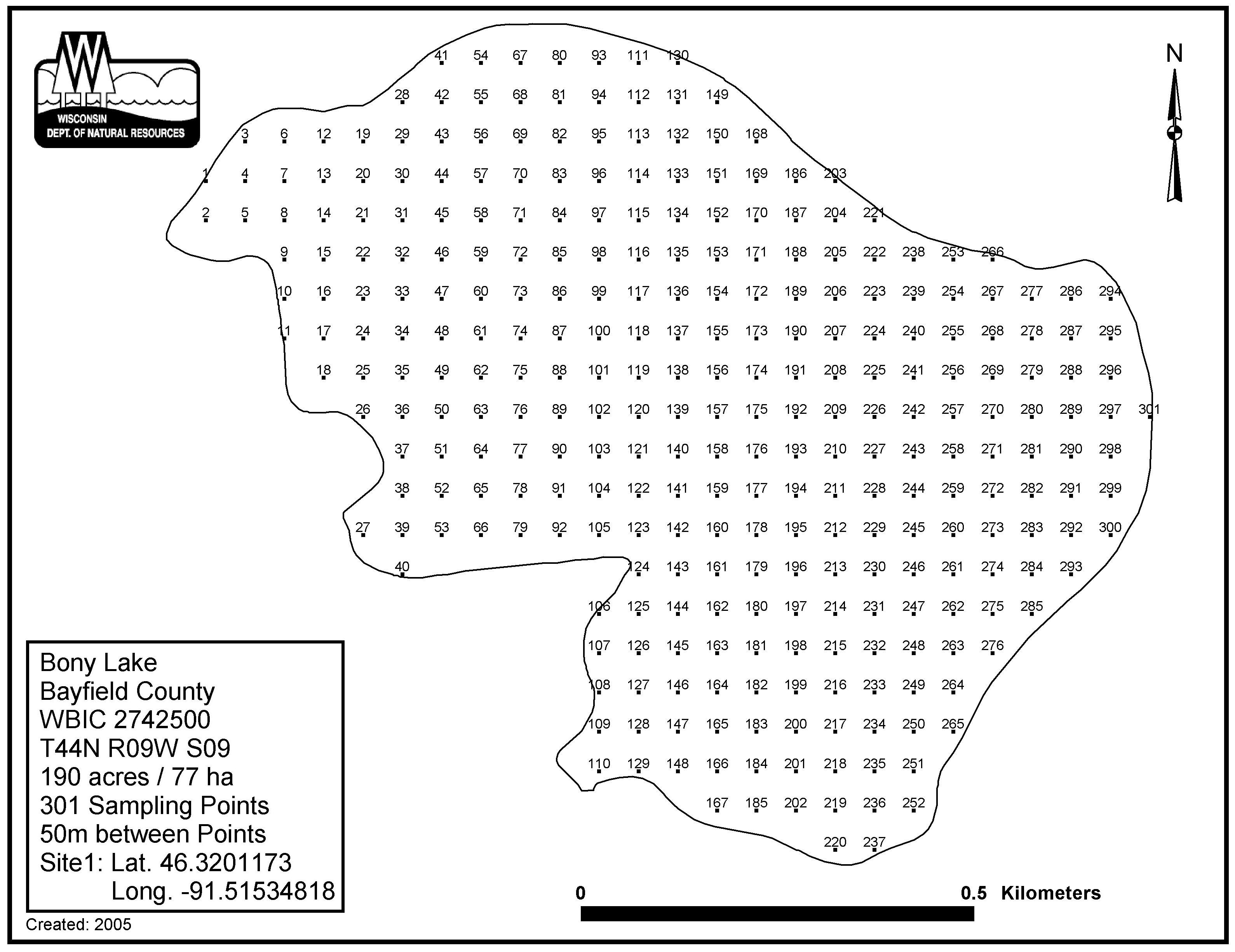 Bony Lake, Bayfield County - Aquatic Plant Sampling Map (50 mpts)