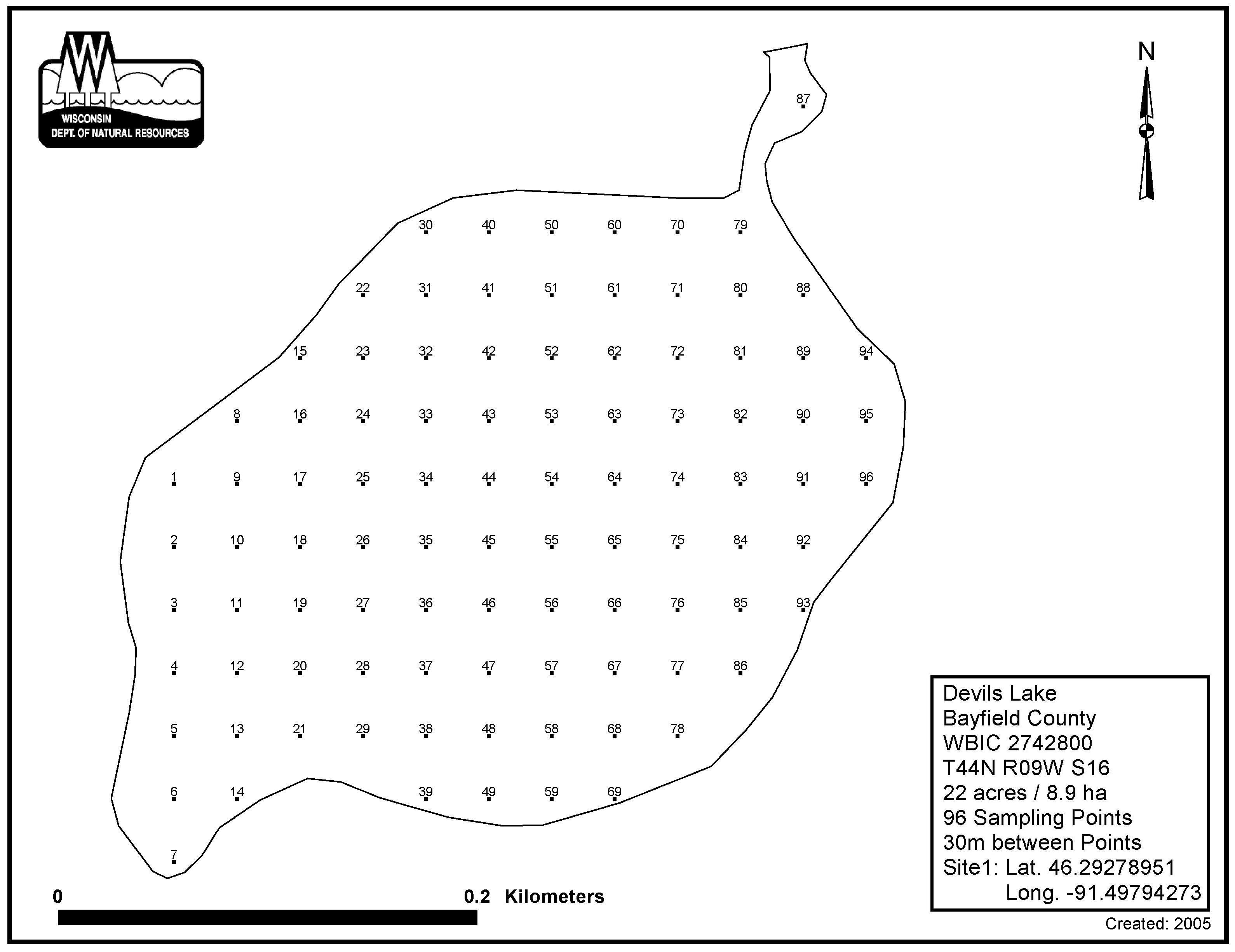 Devils Lake, Bayfield County - Aquatic Plant Sampling Map (30 mpts)