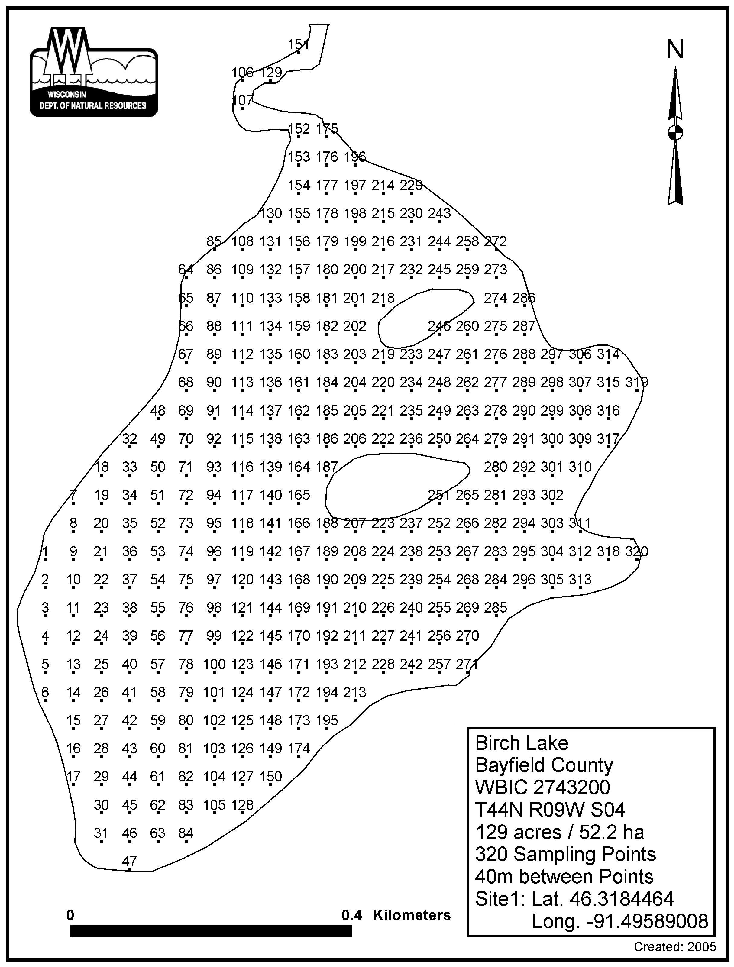 Birch Lake, Bayfield County - Aquatic Plant Sampling Map (40 mpts)