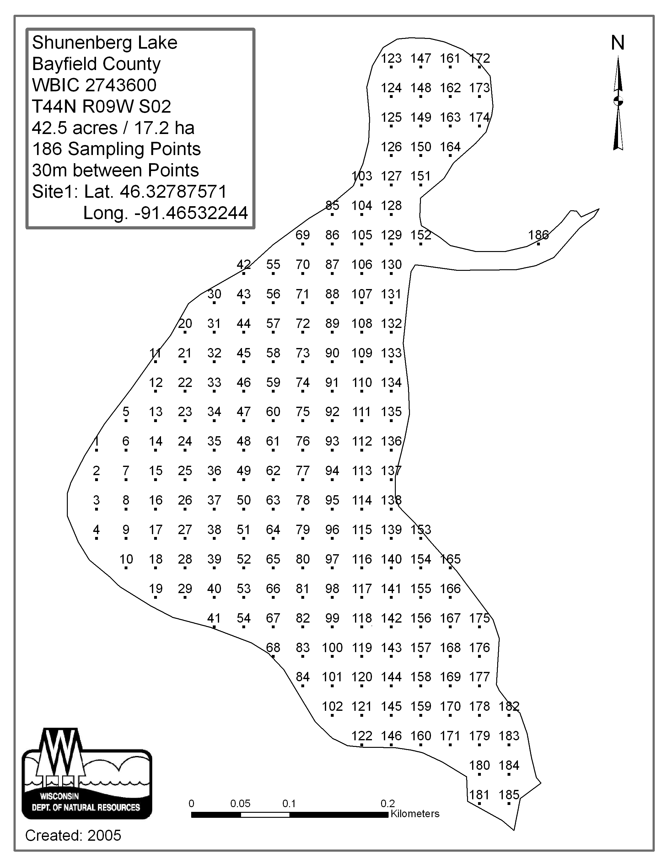 Shunenberg Lake, Bayfield County - Aquatic Plant Sampling Map (30 mpts)