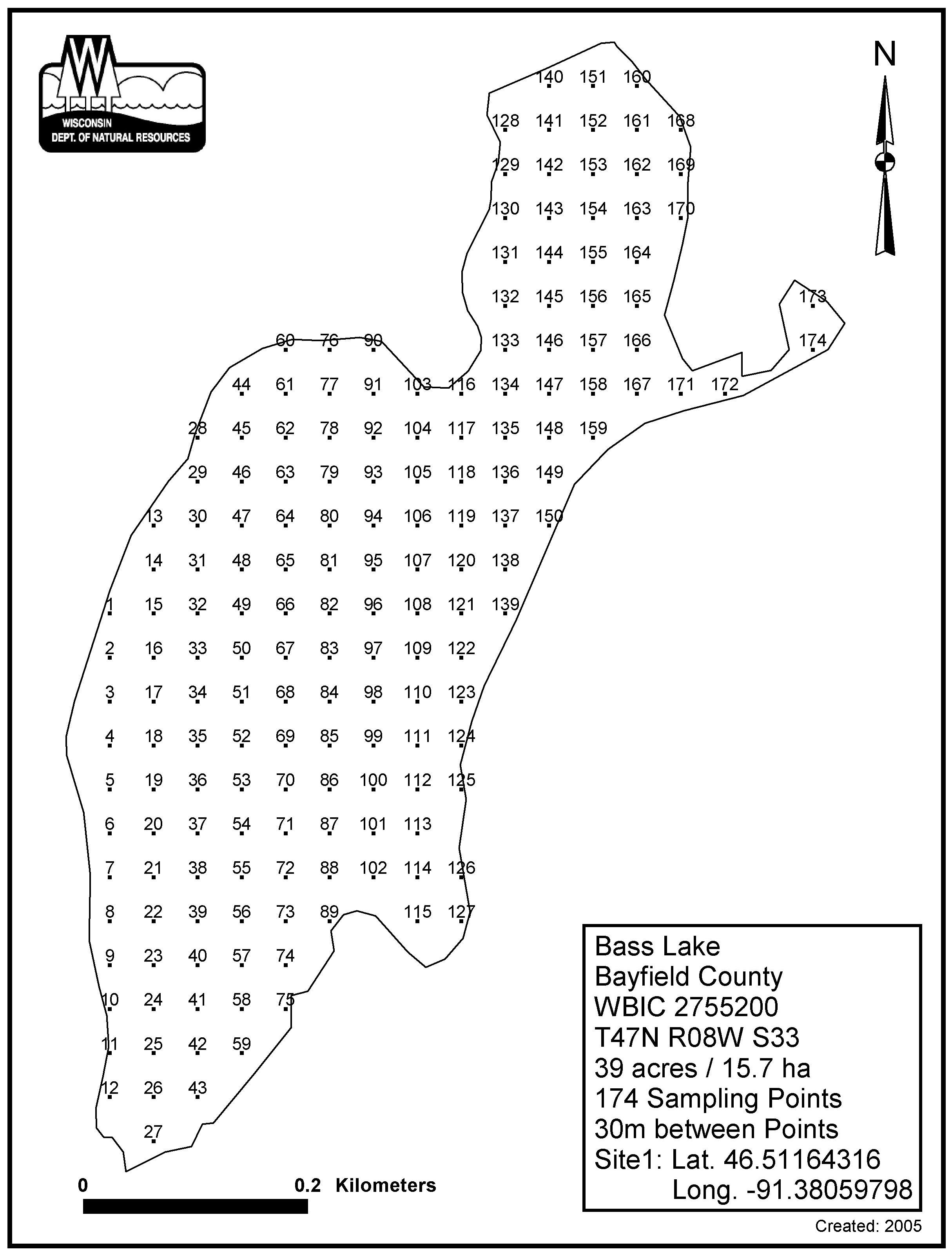 Bass Lake, Bayfield County - Aquatic Plant Sampling Map (30 mpts)