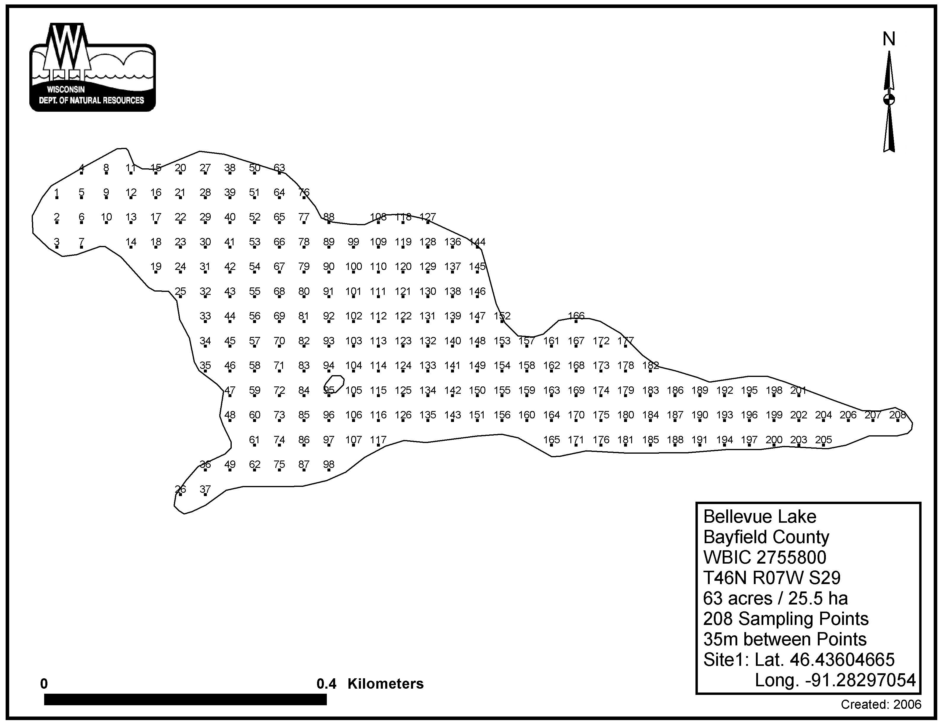 Bellevue Lake, Bayfield County - Aquatic Plant Sampling Map (35 mpts)
