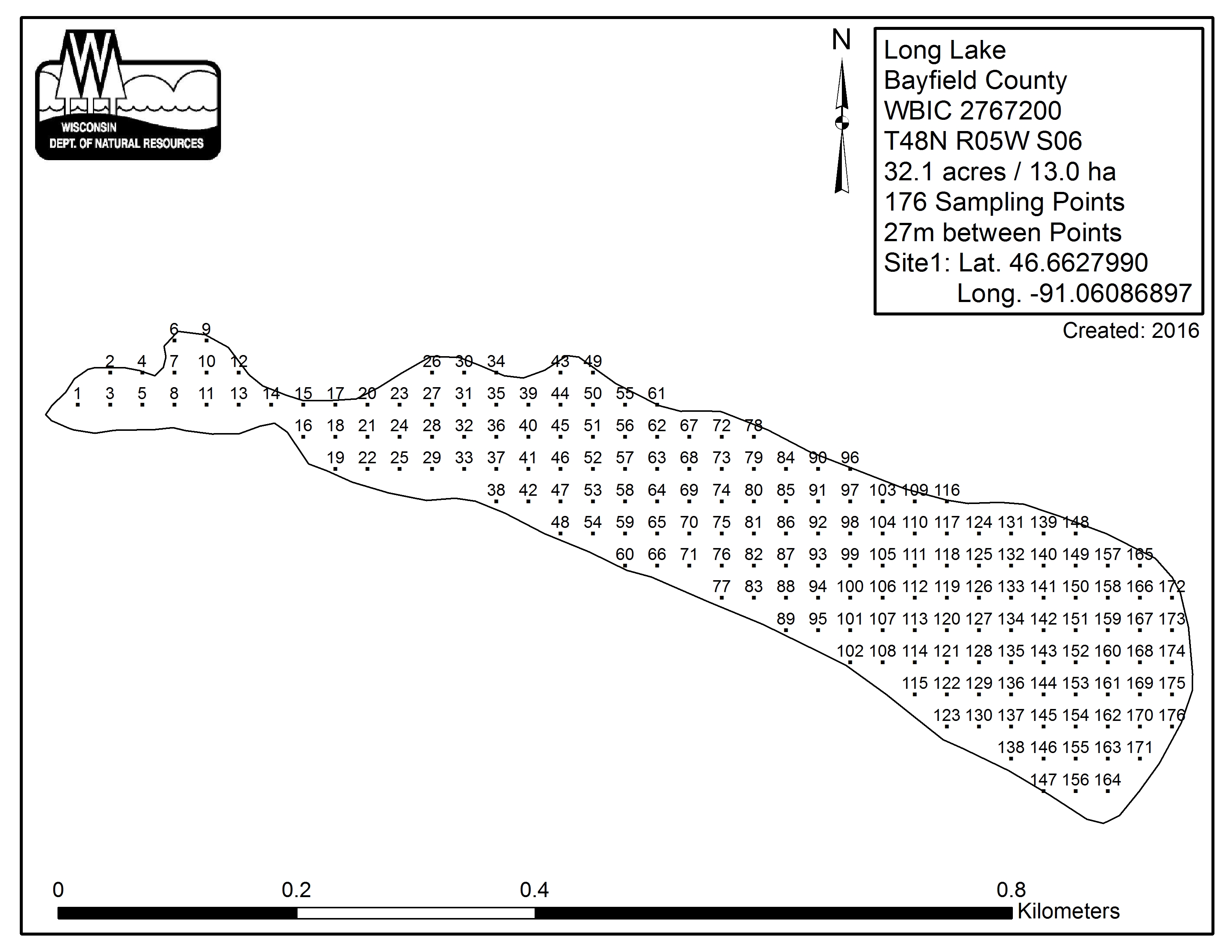 Long Lake, Bayfield County (2767200) - Aquatic Plant Sampling Map (27 mpts)