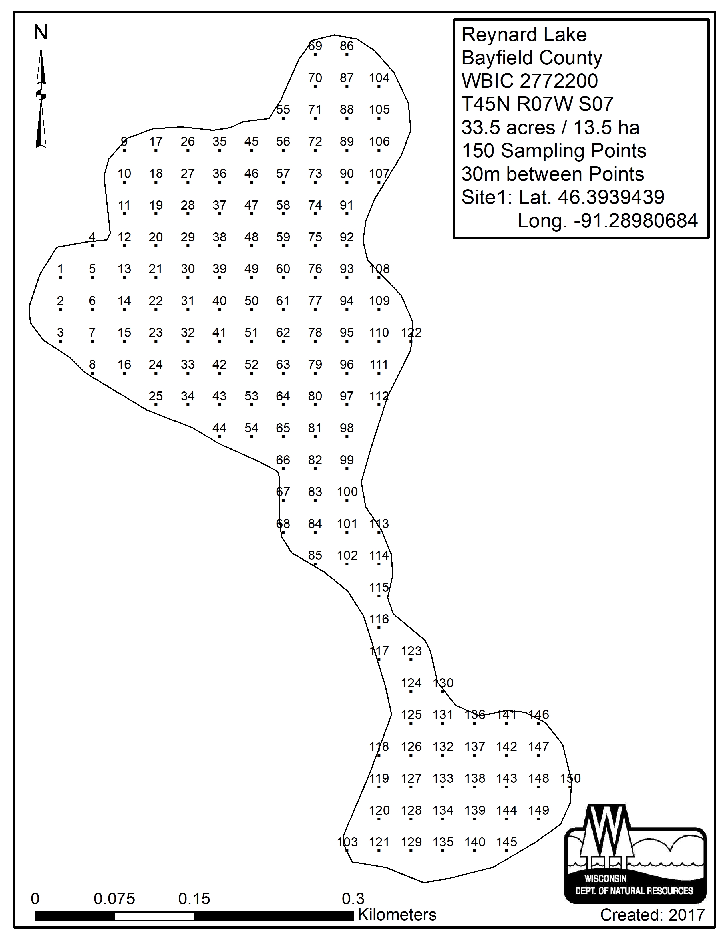 Reynard Lake, Bayfield County - Aquatic Plant Sampling Map (30 mpts)