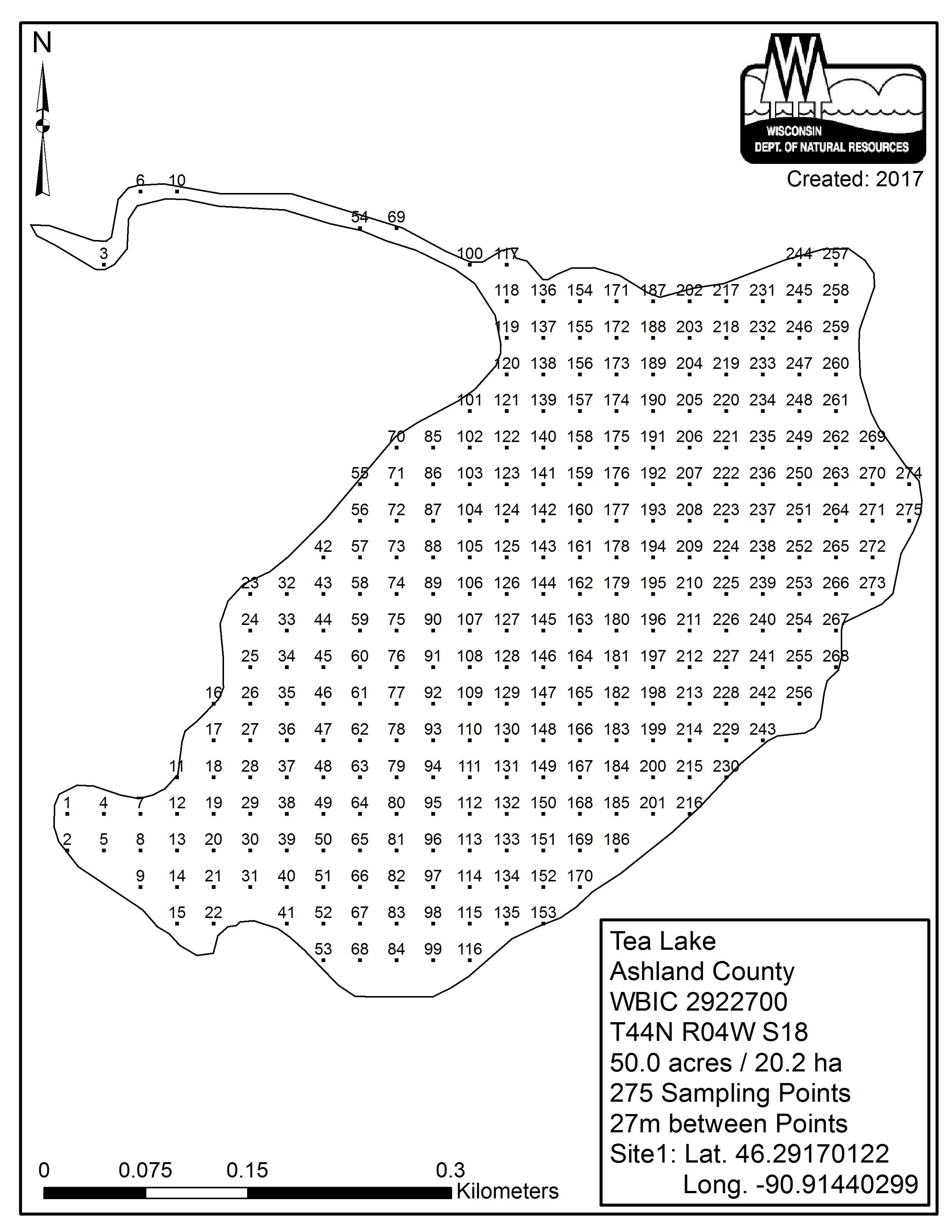 Tea Lake, Ashland County - Aquatic Plant Sampling Map (27 mpts)