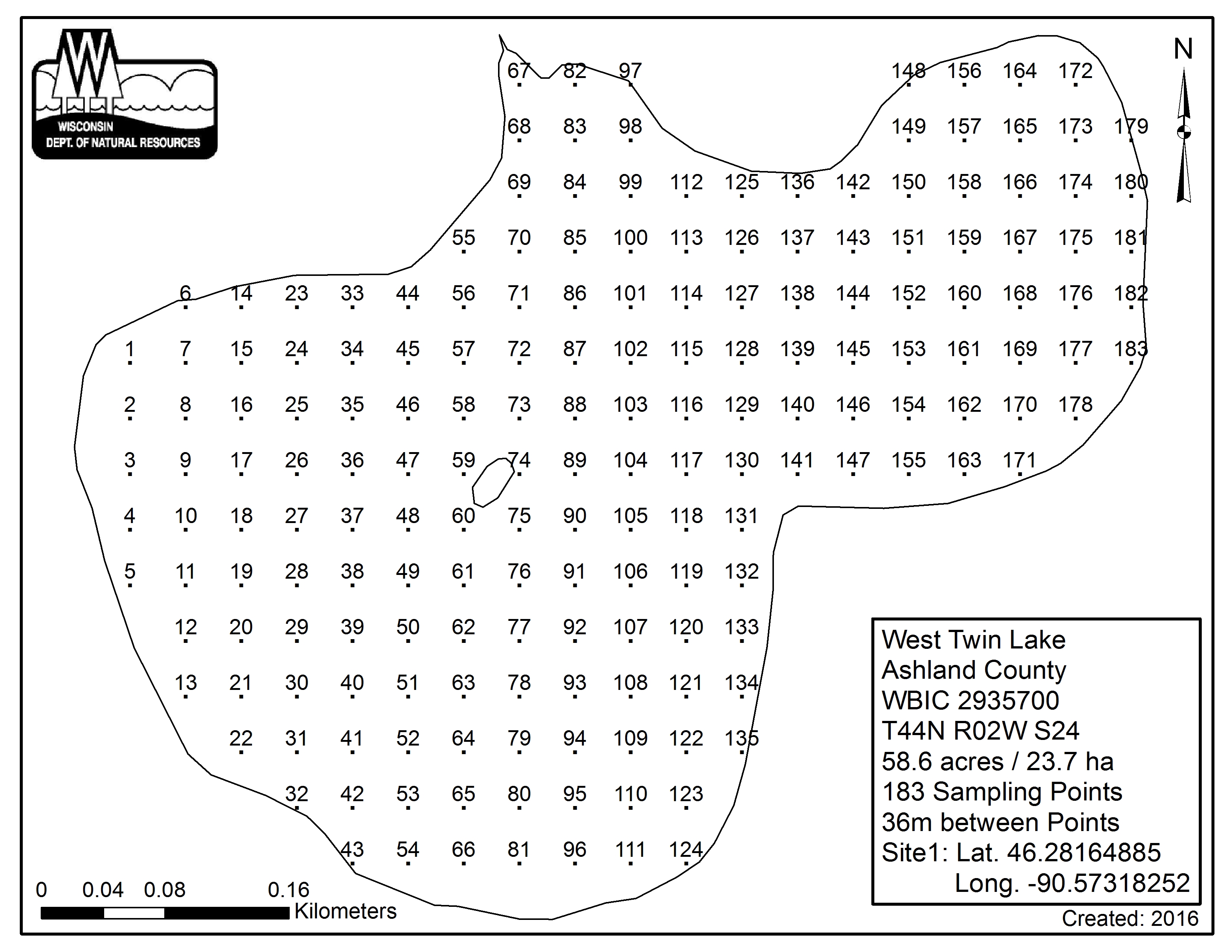 West Twin Lake, Ashland County - Aquatic Plant Sampling Map (36 mpts)