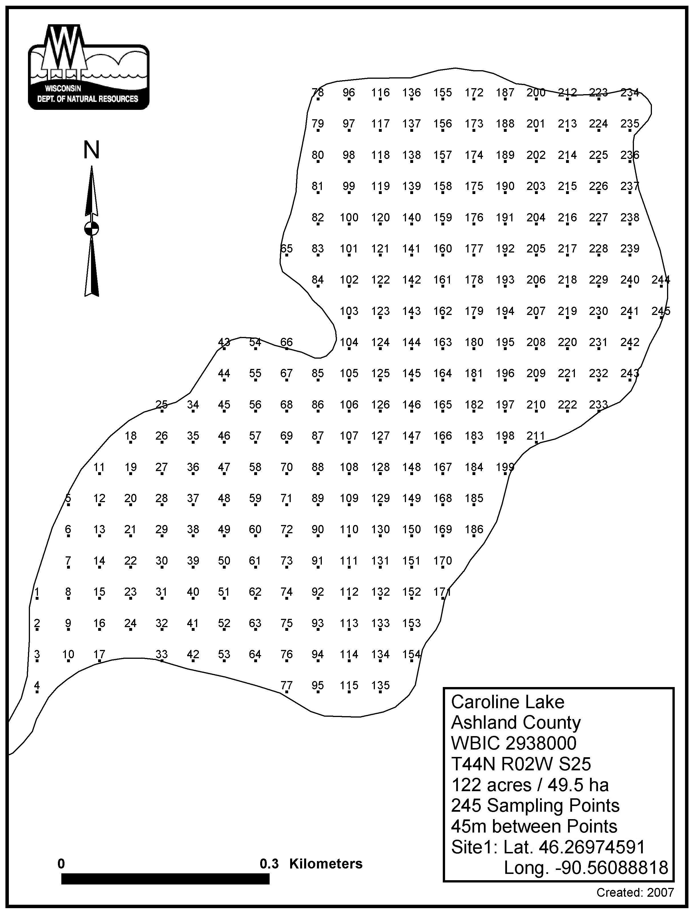 Caroline Lake, Ashland/Iron County - Aquatic Plant Sampling Map (45 mpts)