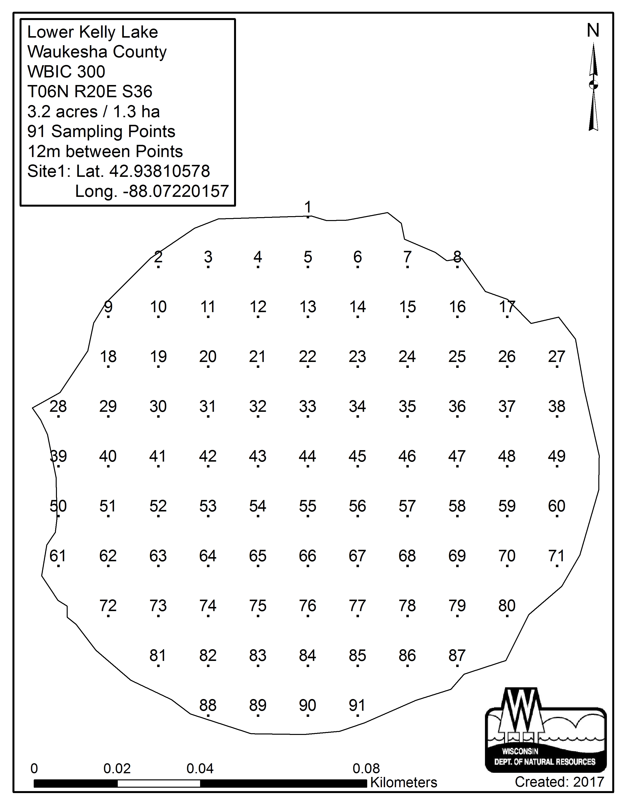 Lower Kelly Lake, Waukesha County - Aquatic Plant Sampling Map (12 mpts)