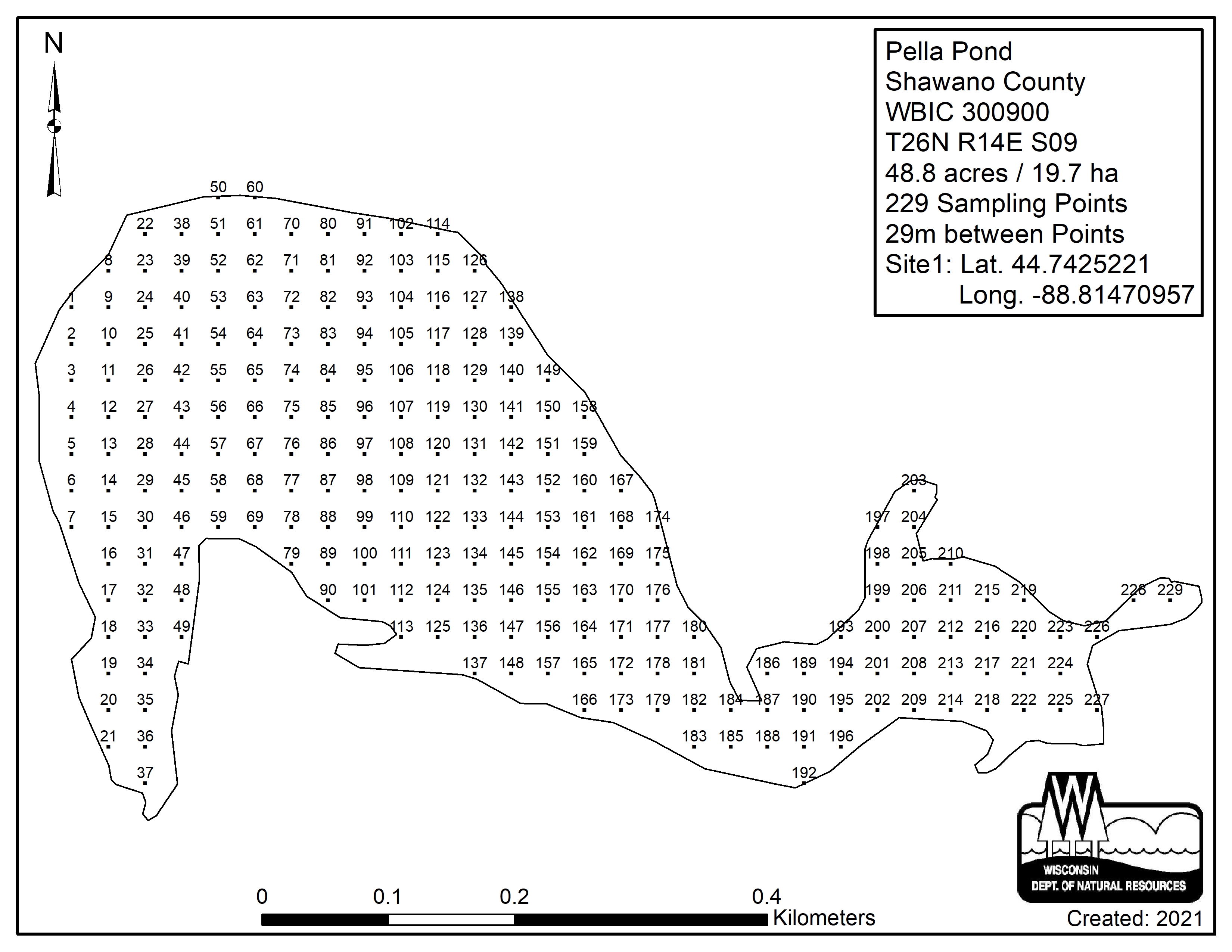 Pella Pond, Shawano County - Aquatic Plant Sampling Map (29 mpts)