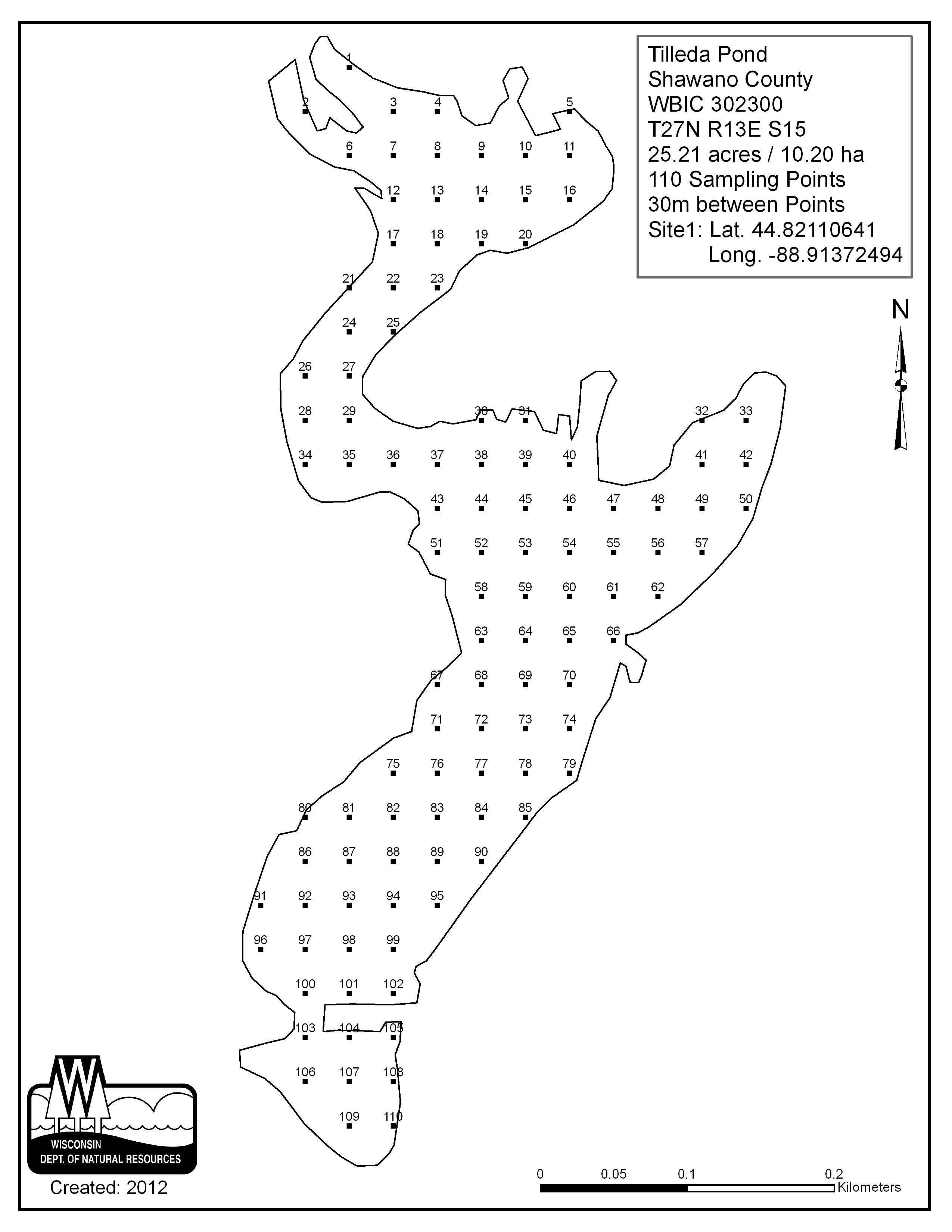 Tilleda Pond, Shawano County - Aquatic Plant Sampling Map (30 mpts)