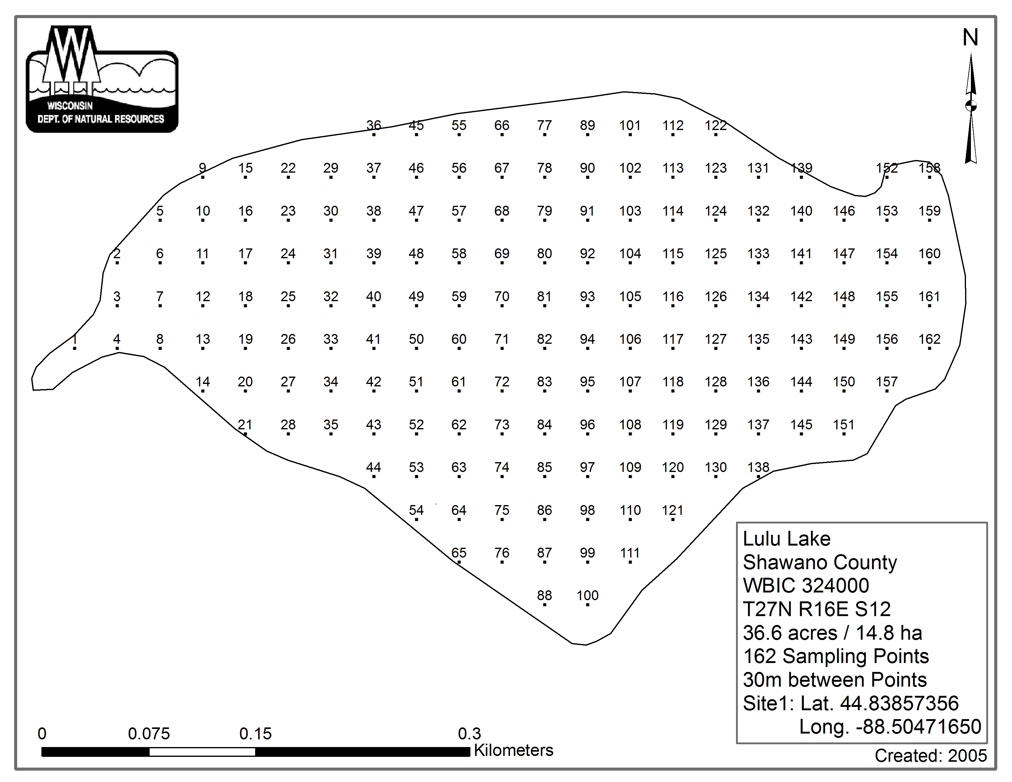 Lulu Lake, Shawano County - Aquatic Plant Sampling Map (30 mpts)
