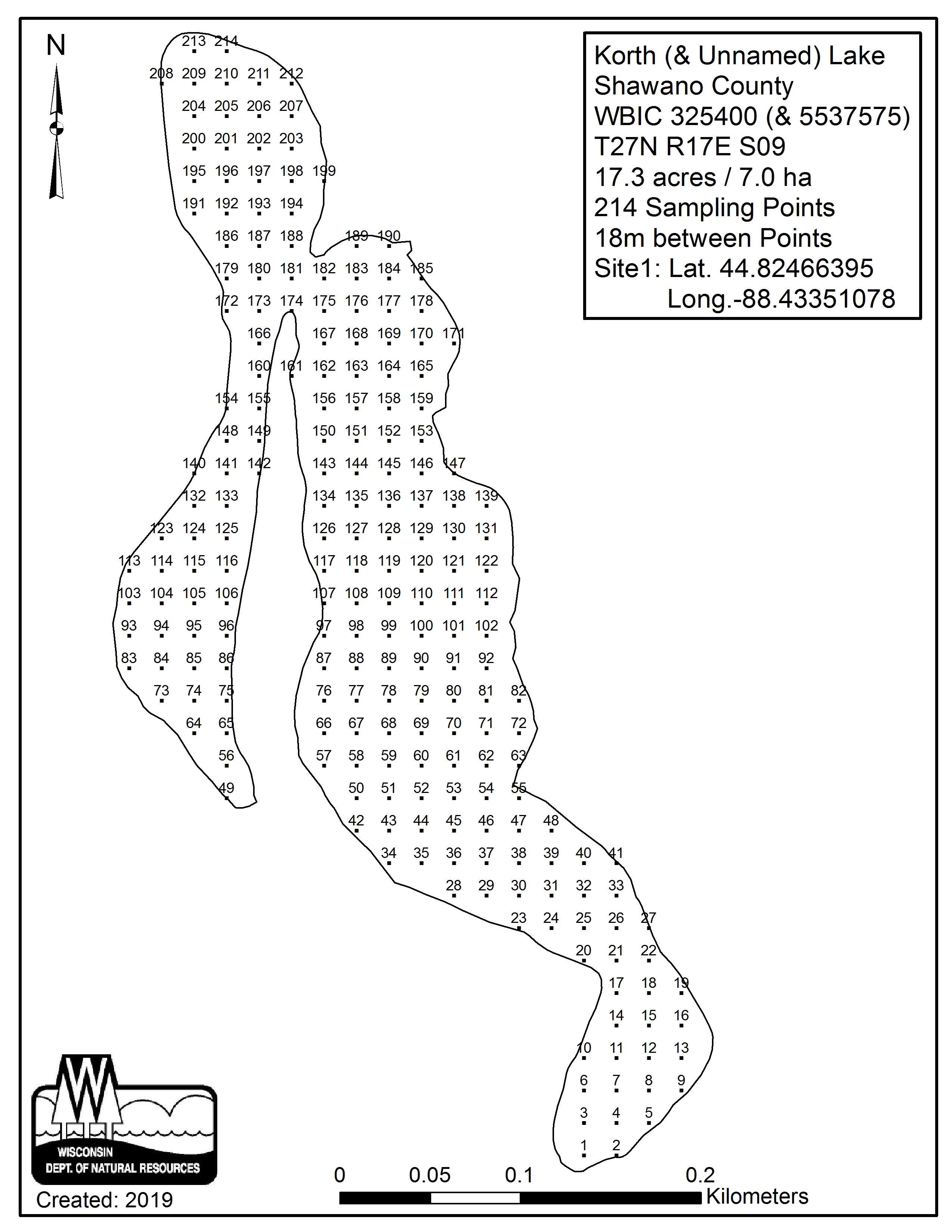 Korth Lake, Shawano County - Aquatic Plant Sampling Map (18 mpts)