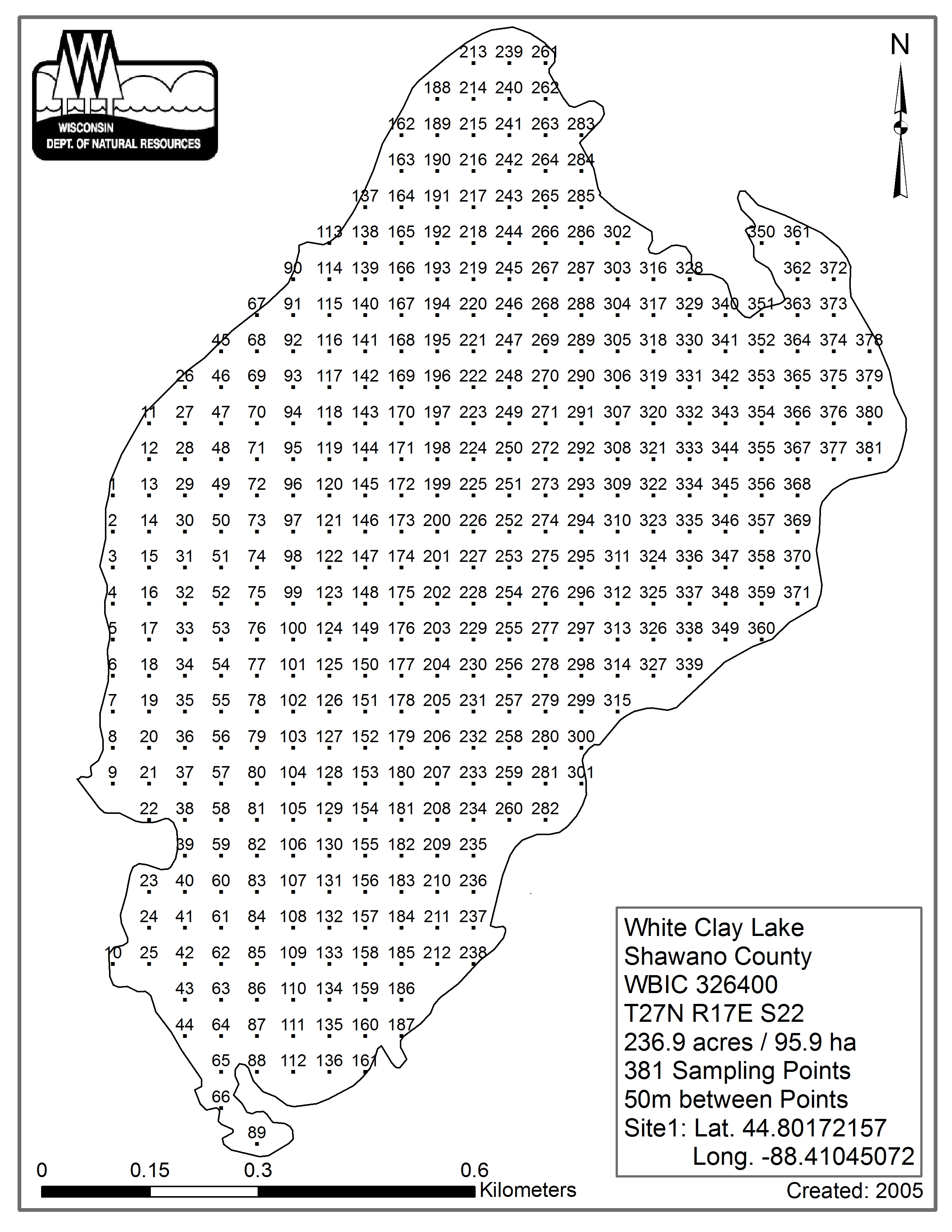 White Clay Lake, Shawano County - Aquatic Plant Sampling Map (50 mpts)