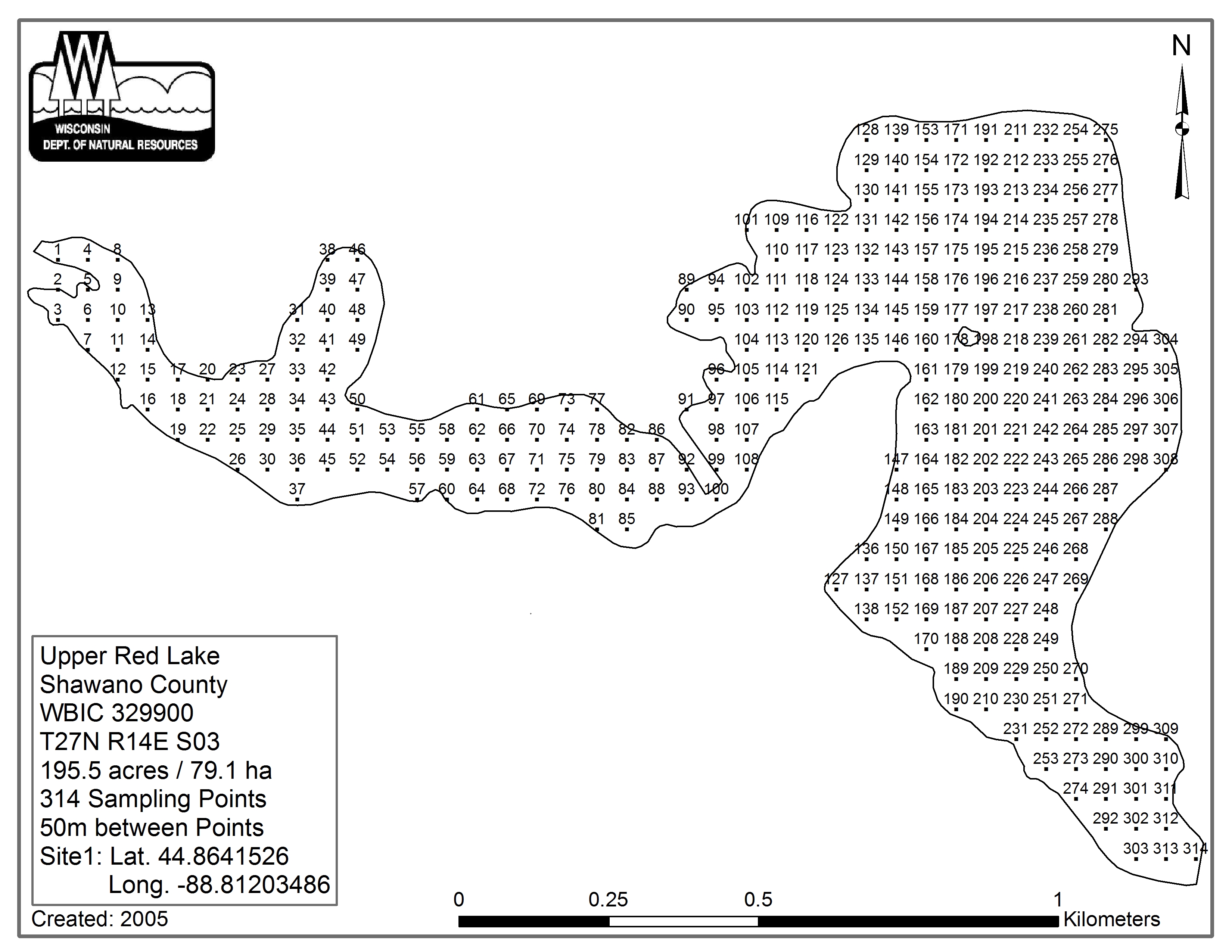 Upper Red Lake, Shawano County - Aquatic Plant Sampling Map (50 mpts)
