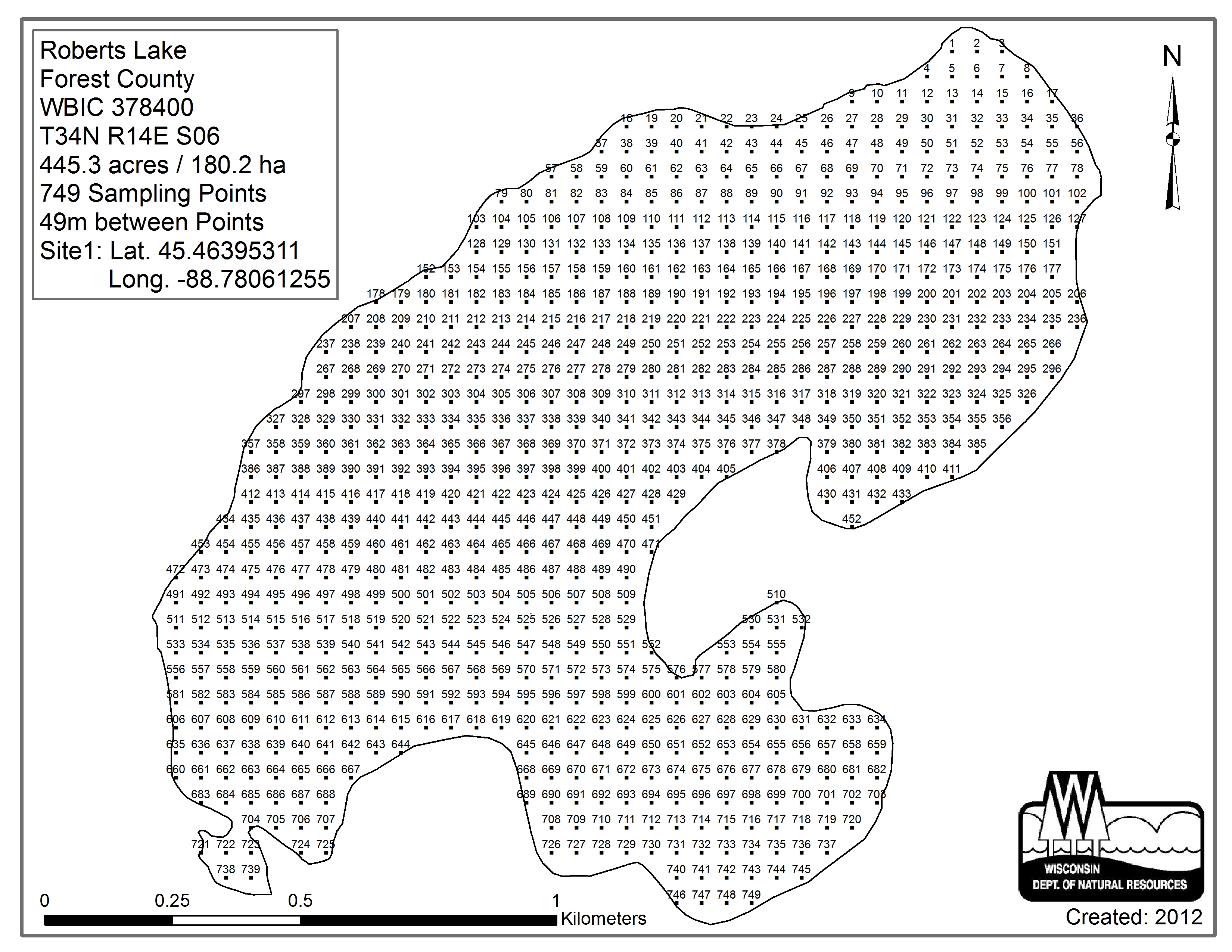 Roberts Lake, Forest County - Aquatic Plant Sampling Map (49 mpts)