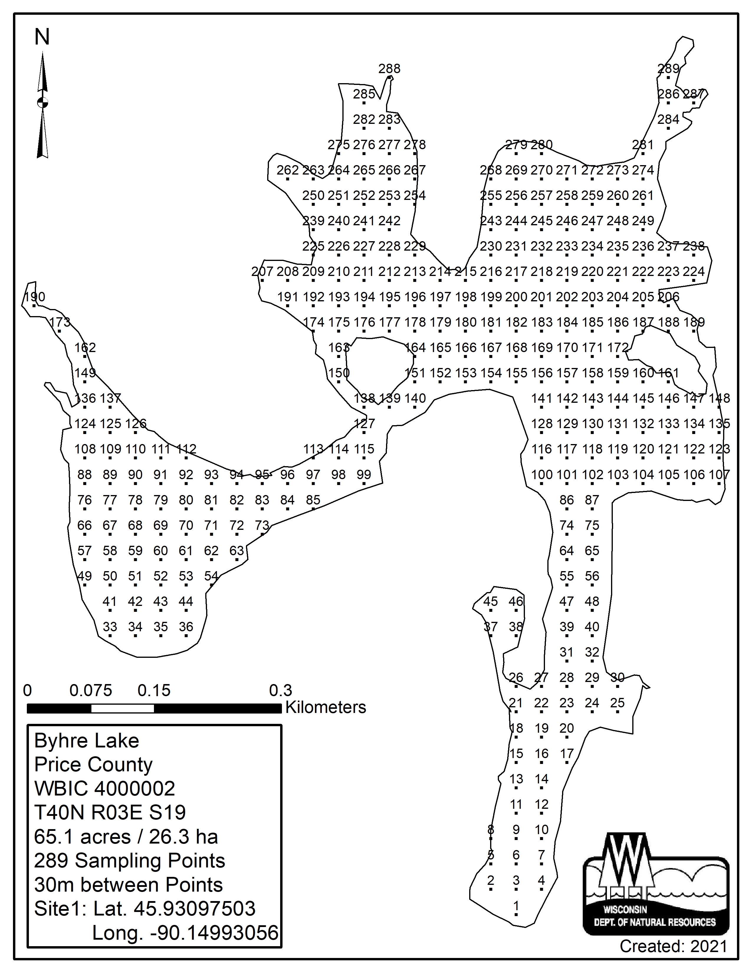 Byhre Lake, Price County - Aquatic Plant Sampling Map (30 mpts)