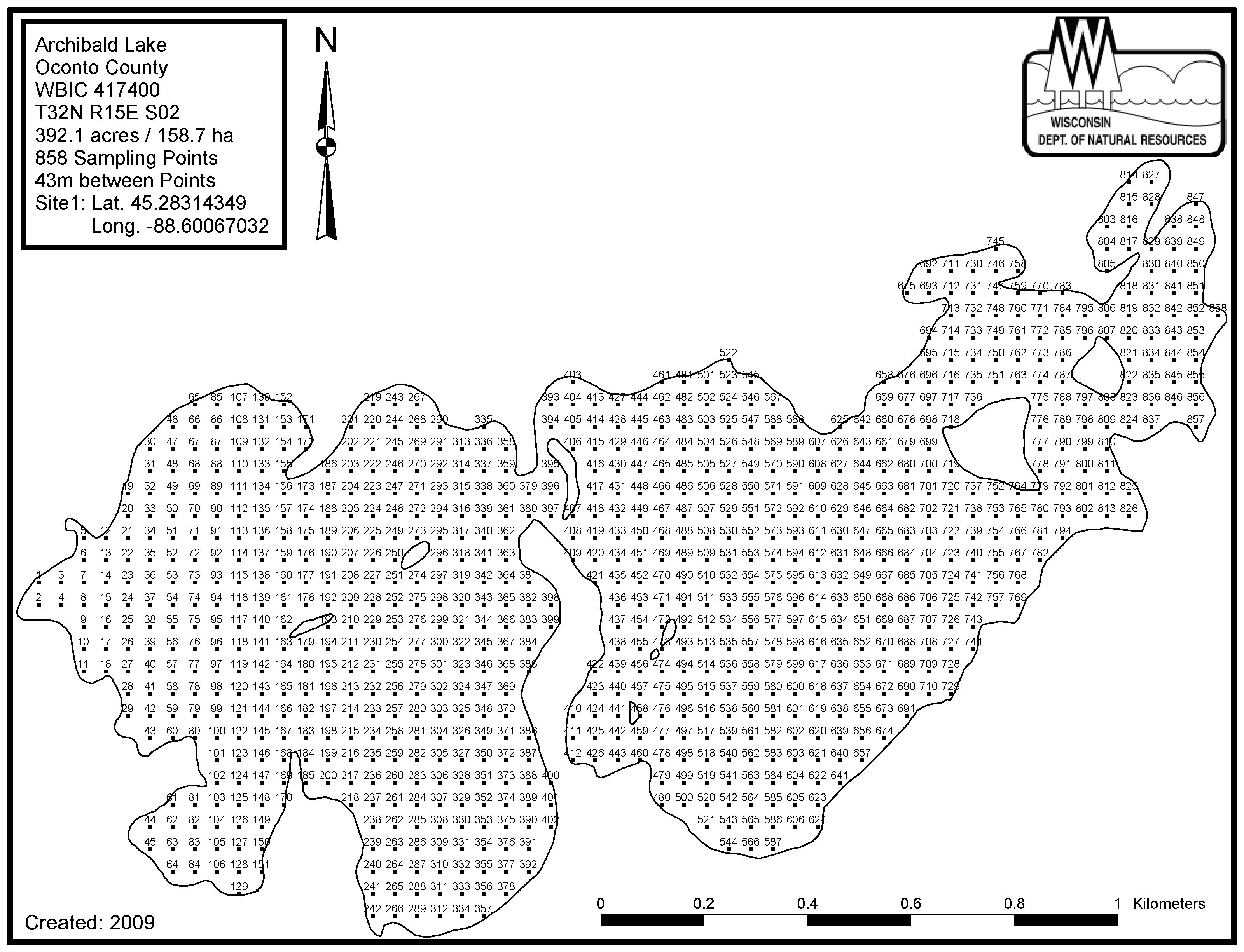 Archibald Lake, Oconto County - Aquatic Plant Sampling Map (43 mpts)
