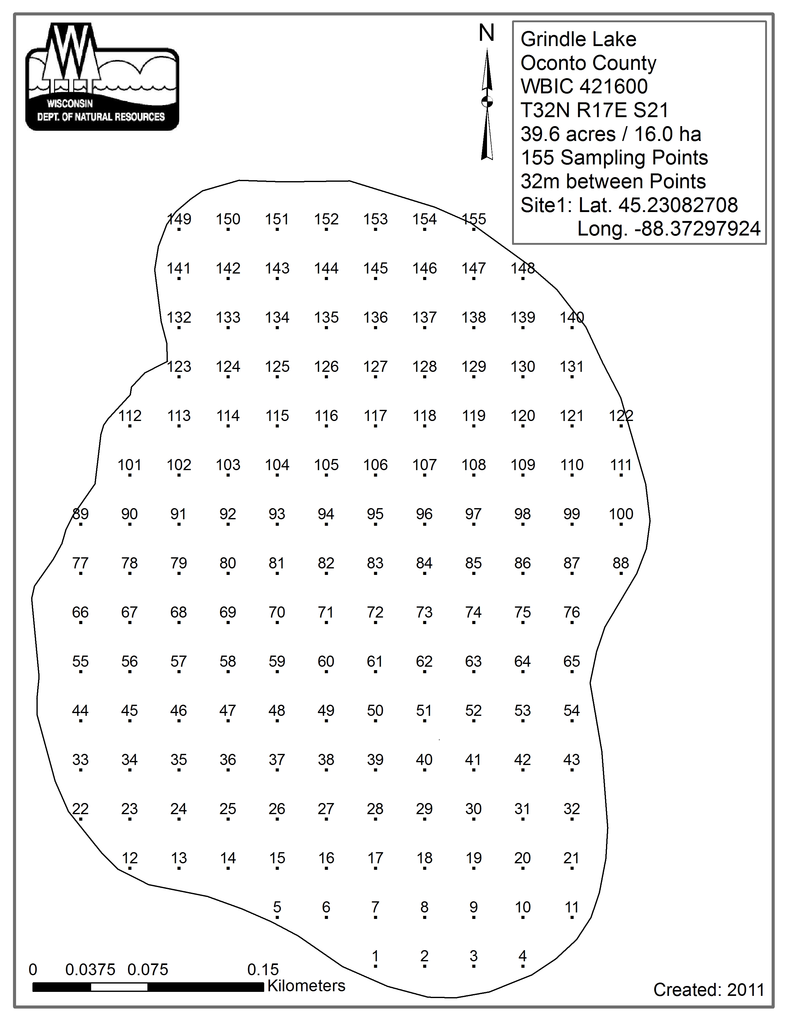 Grindle Lake, Oconto County - Aquatic Plant Sampling Map (32 mpts)