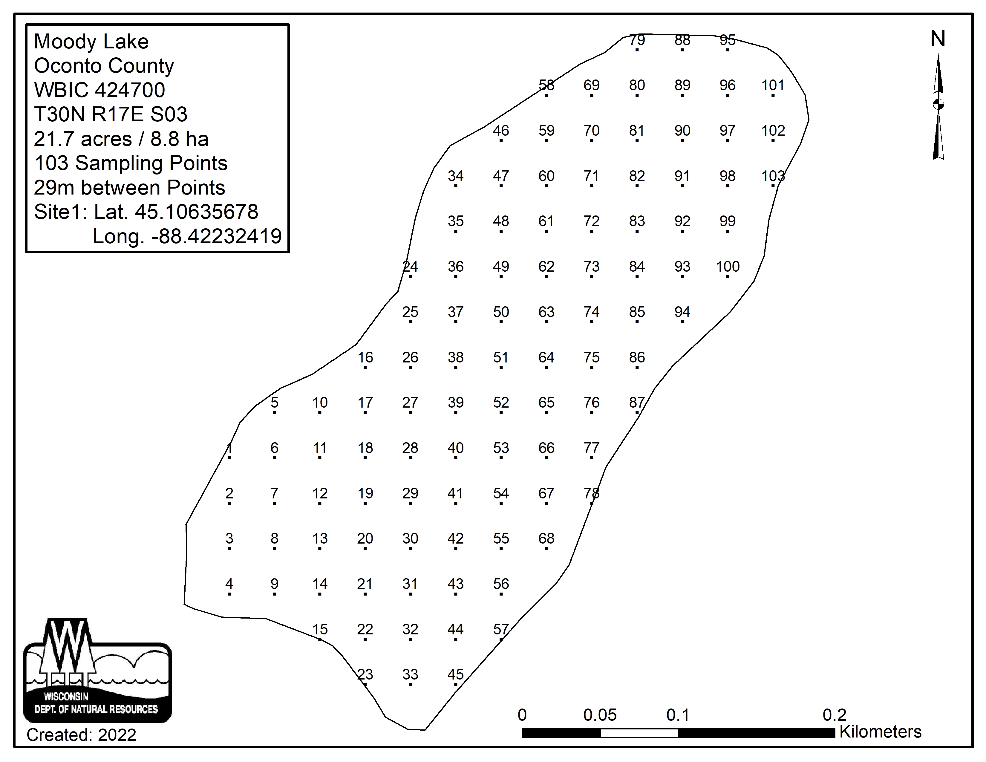 Moody Lake, Oconto County - Aquatic Plant Sampling Map (29 mpts)