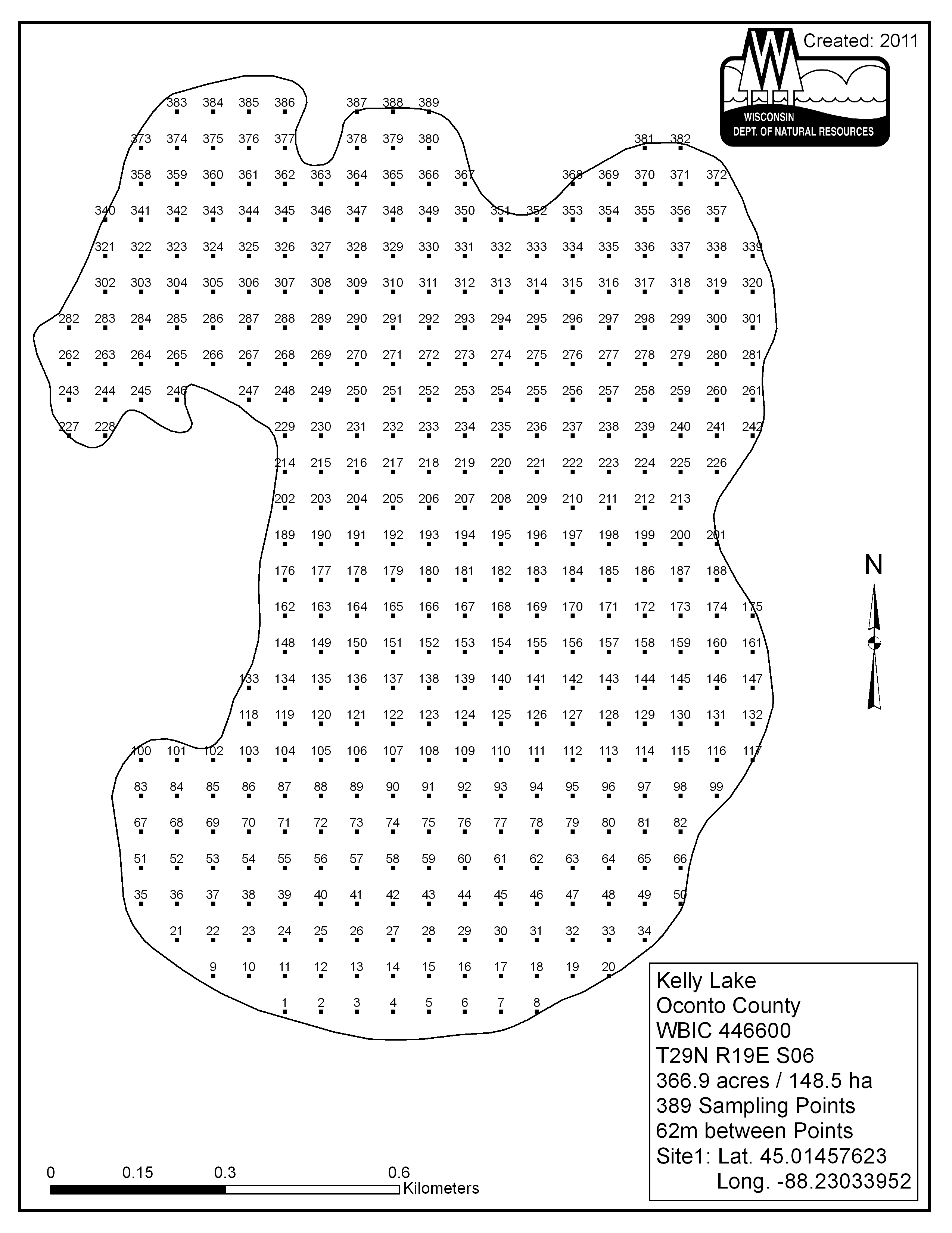 Kelly Lake, Oconto County - Aquatic Plant Sampling Map (62 mpts)