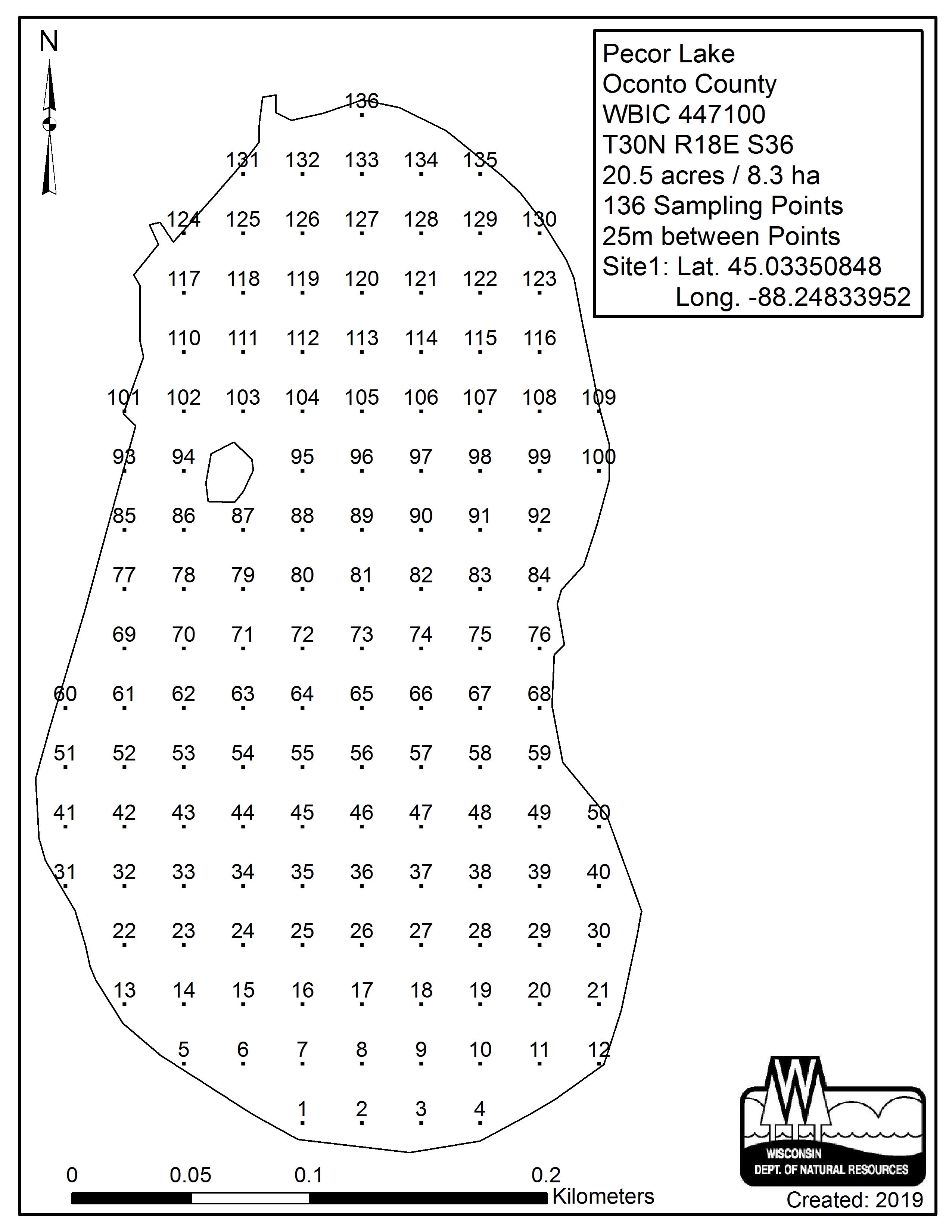 Pecor Lake, Oconto County - Aquatic Plant Sampling Map (25 mpts)