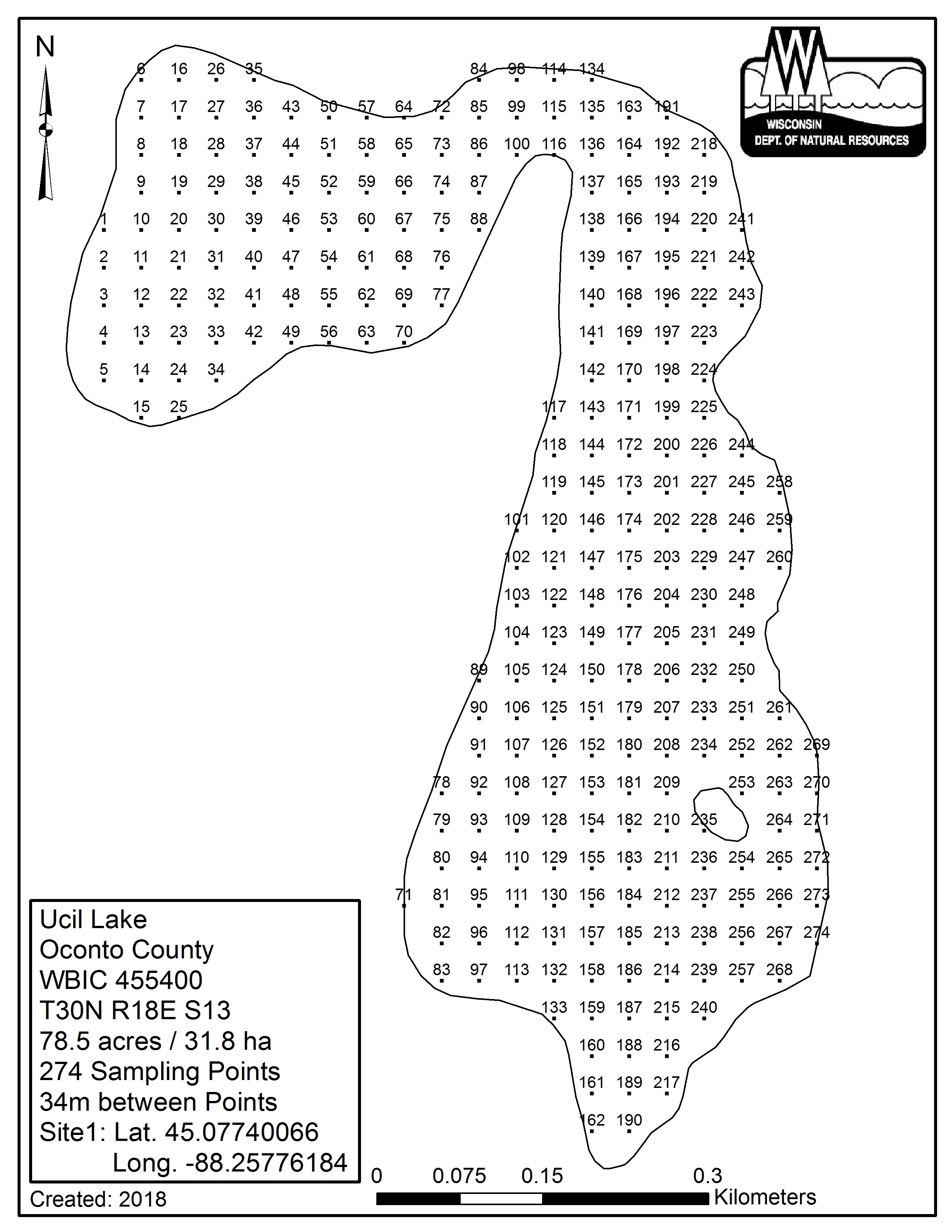 Ucil Lake, Oconto County - Aquatic Plant Sampling Map (34 mpts)