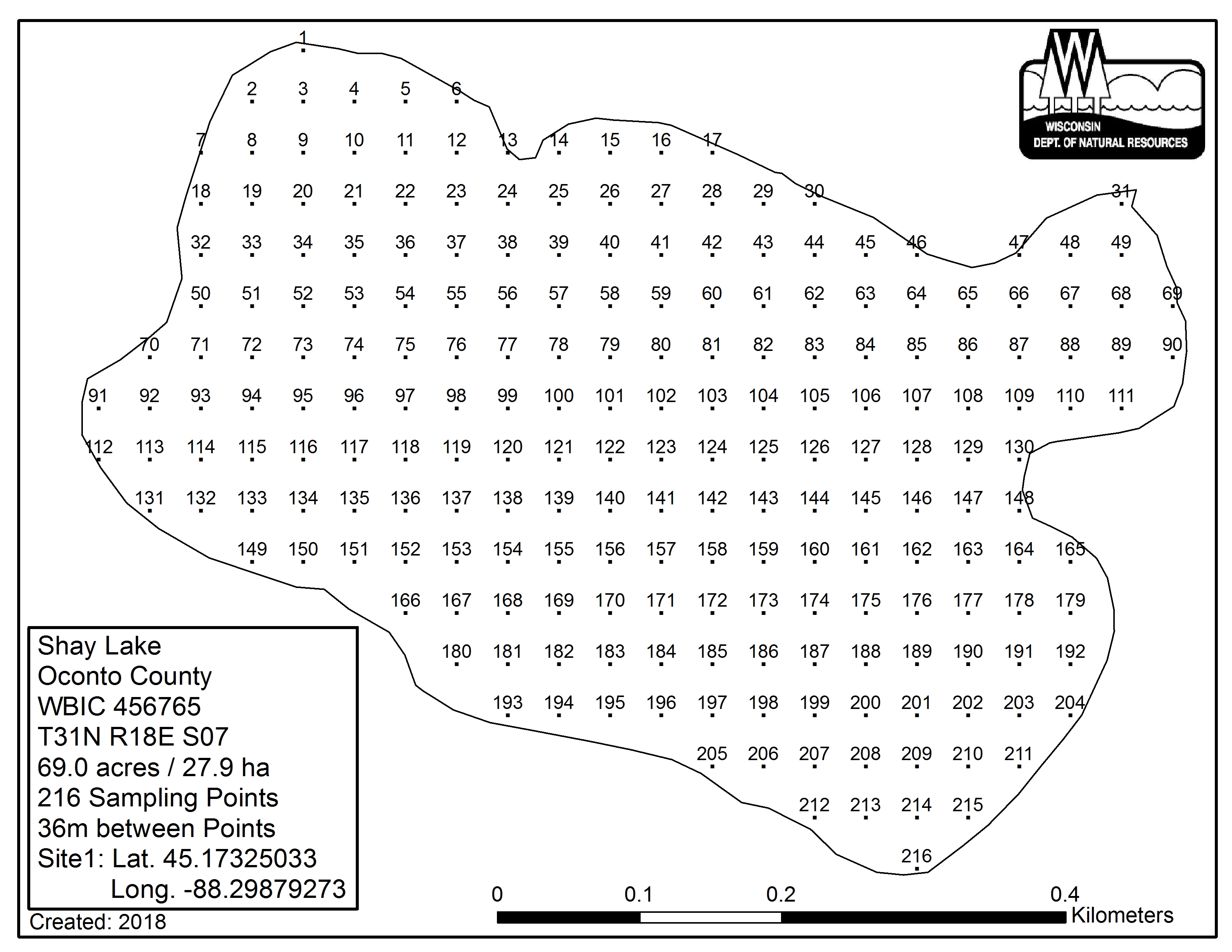 Shay Lake, Oconto County - Aquatic Plant Sampling Map (36 mpts)