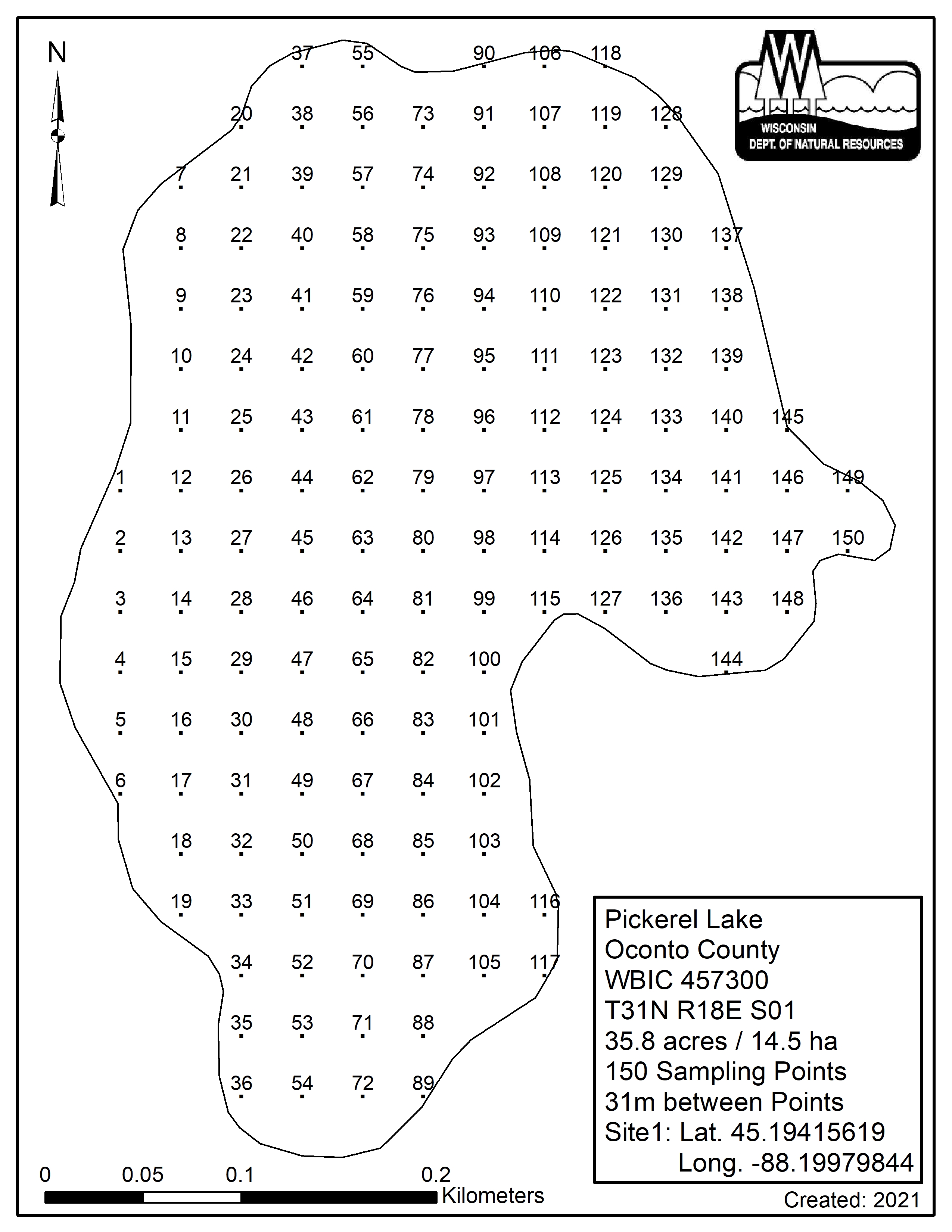 Pickerel Lake, Oconto County (457300) - Aquatic Plant Sampling Map (31 mpts)