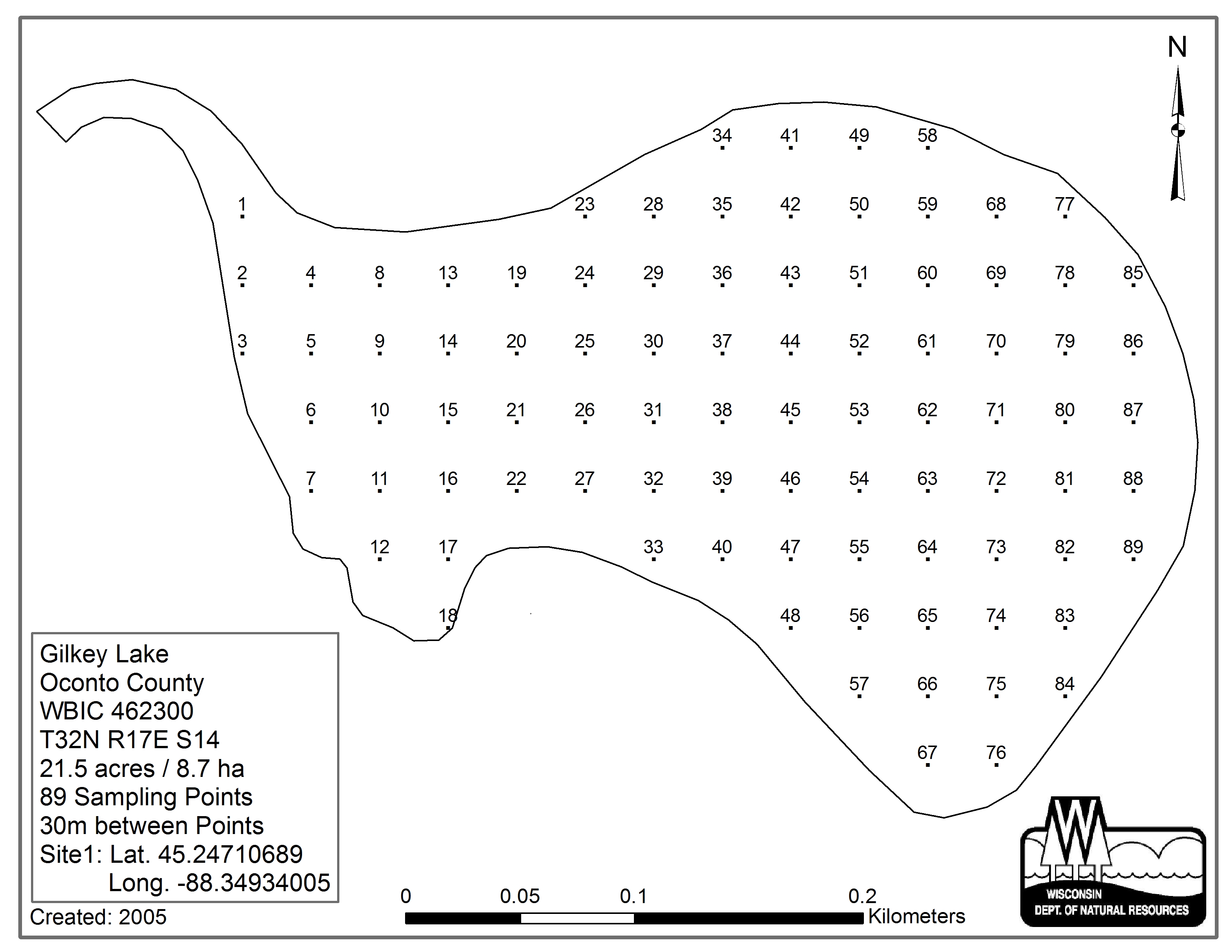 Gilkey Lake, Oconto County - Aquatic Plant Sampling Map (30 mpts)
