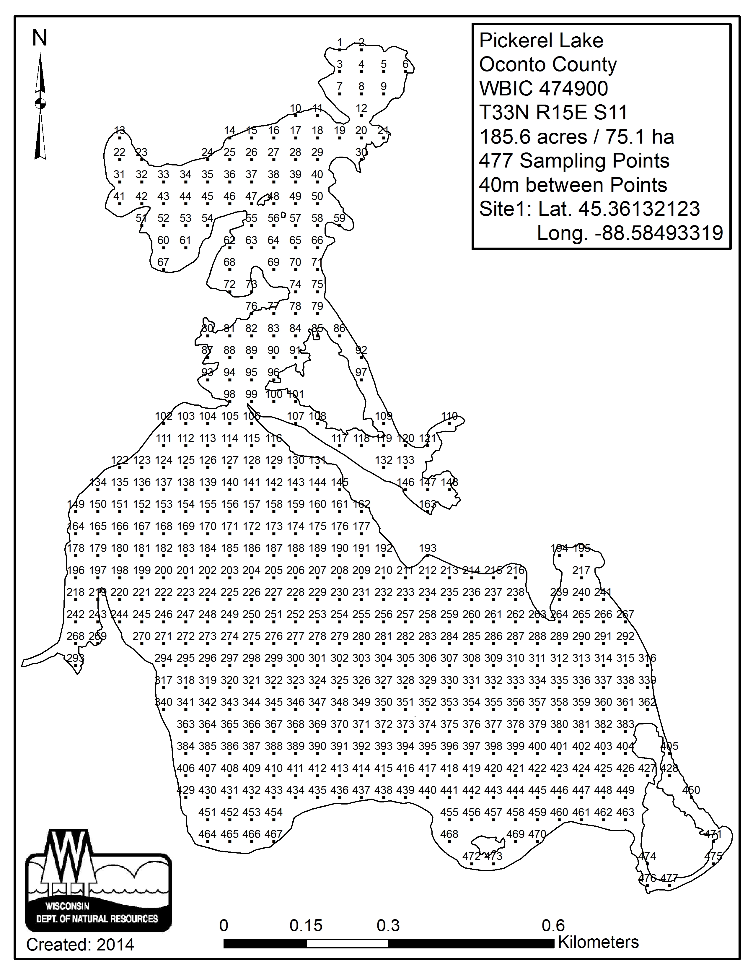 Pickerel Lake, Oconto County (474900) - Aquatic Plant Sampling Map (40 mpts)