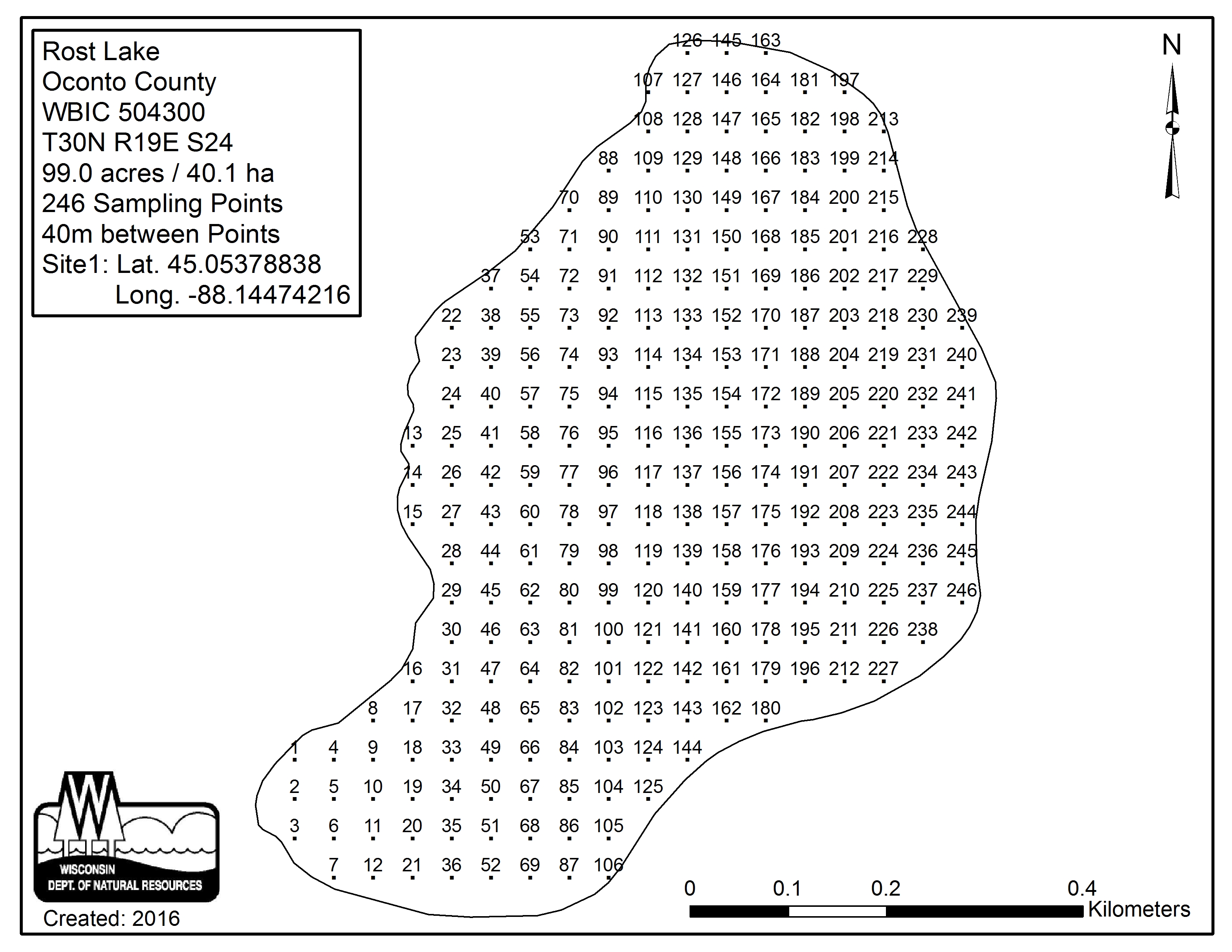Rost Lake, Oconto County - Aquatic Plant Sampling Map (40 mpts)
