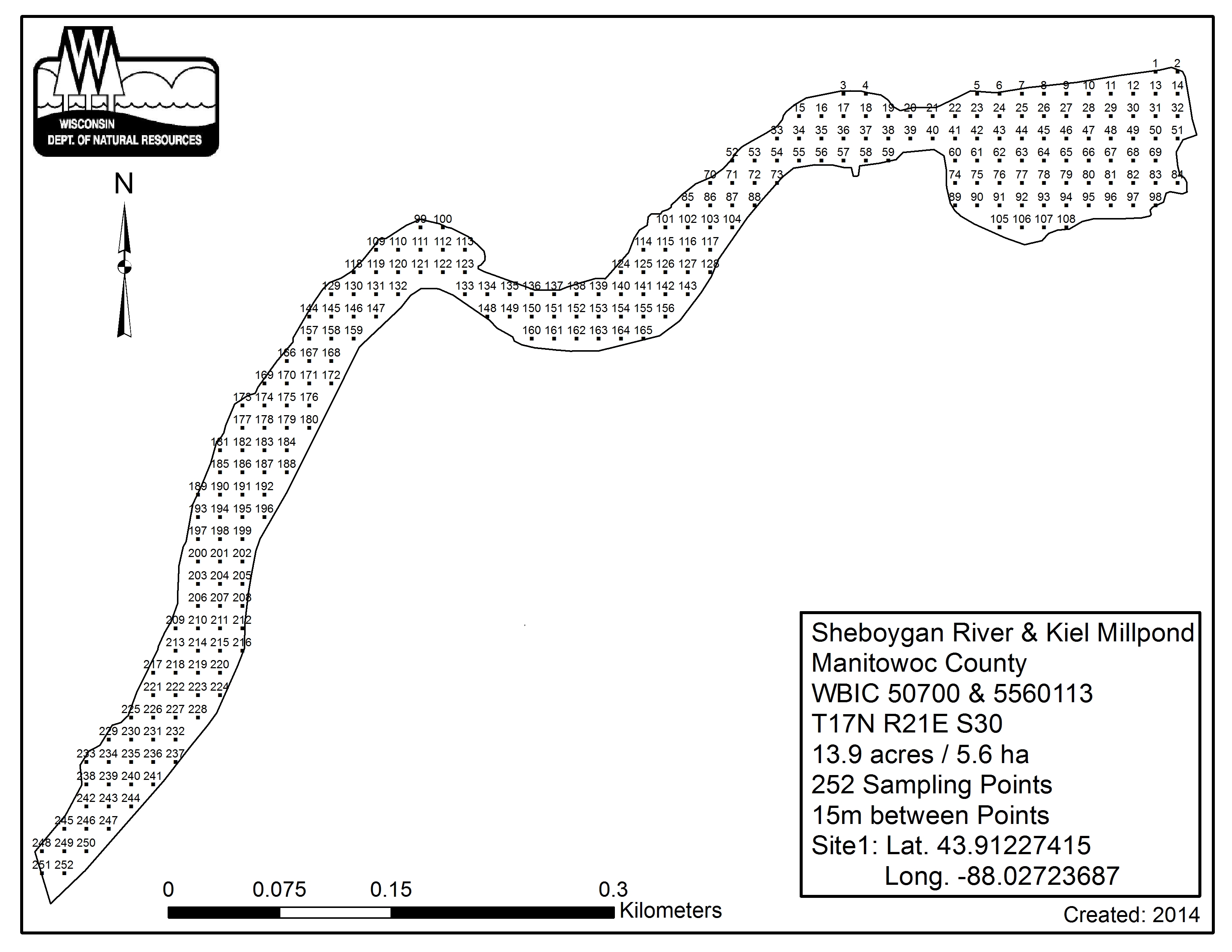 Sheboygan River & Kiel Millpond, Manitowoc County - Aquatic Plant Sampling Map (15 mpts)