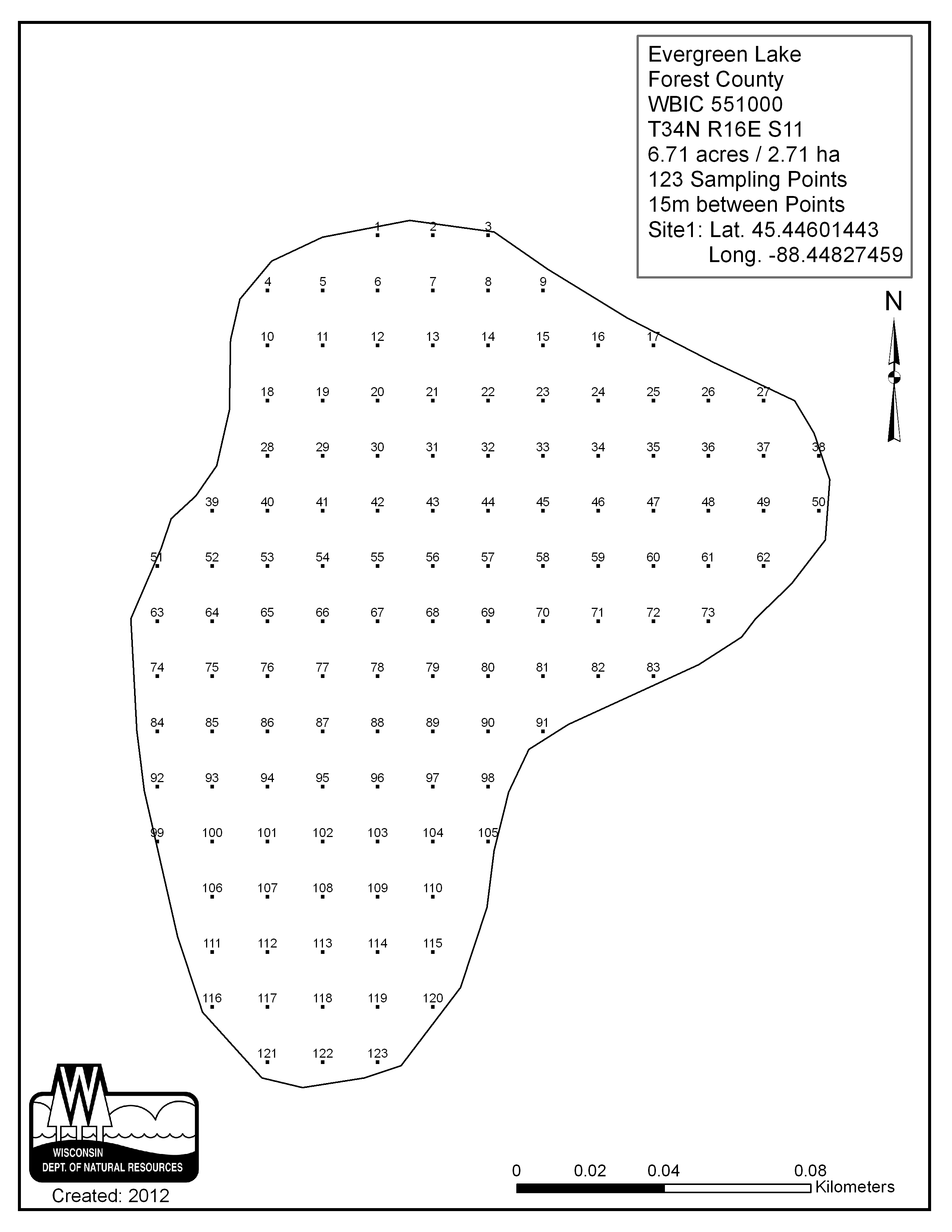 Evergreen Lake, Forest County - Aquatic Plant Sampling Map (15 mpts)