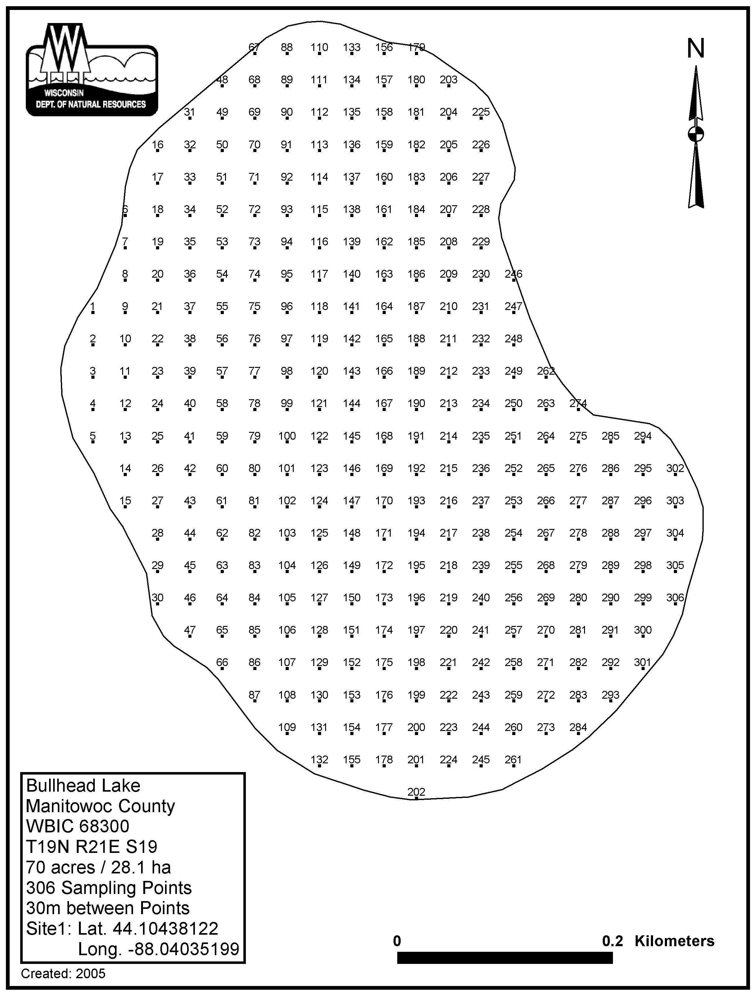 Bullhead Lake, Manitowoc County - Aquatic Plant Sampling Map (30 mpts)