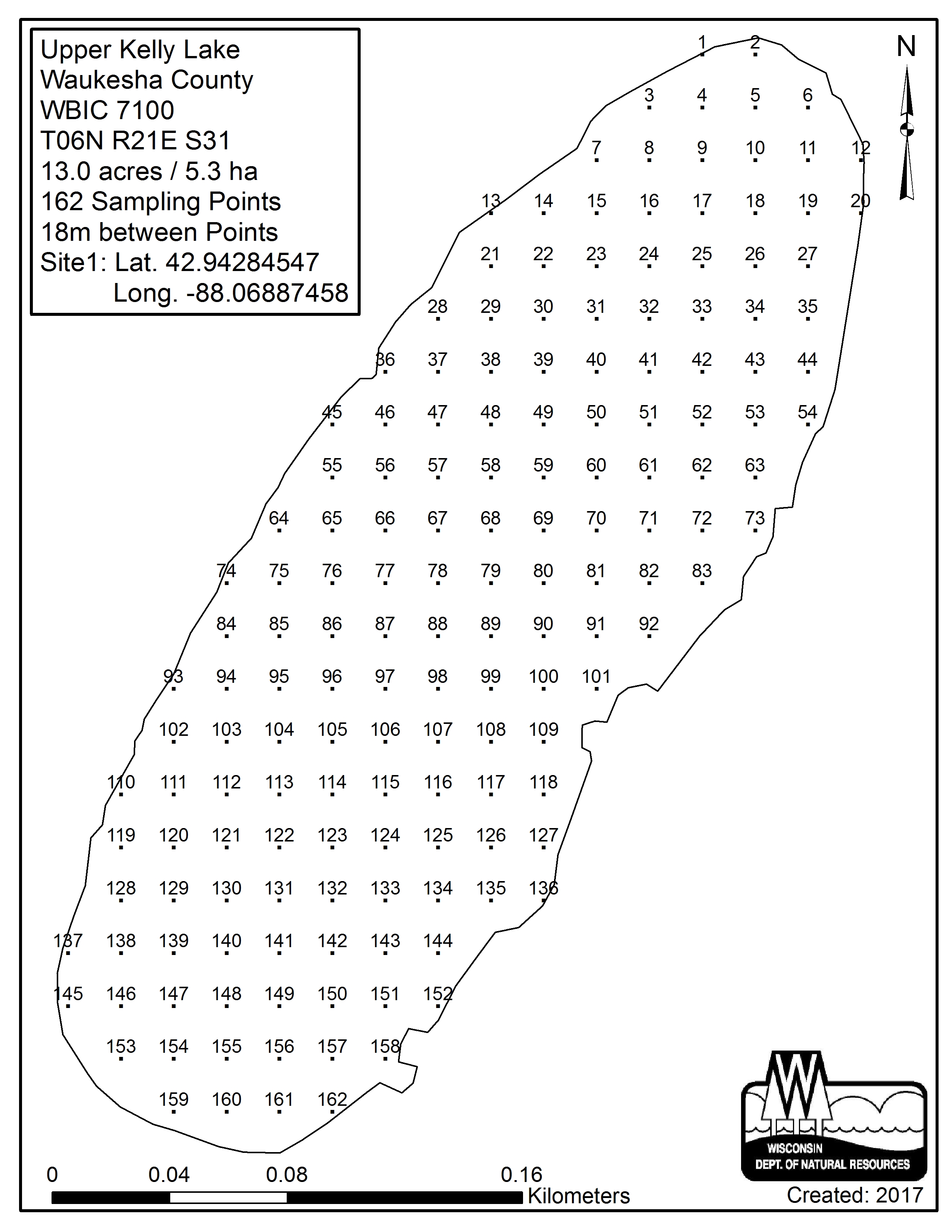 Upper Kelly Lake, Waukesha County - Aquatic Plant Sampling Map (18 mpts)
