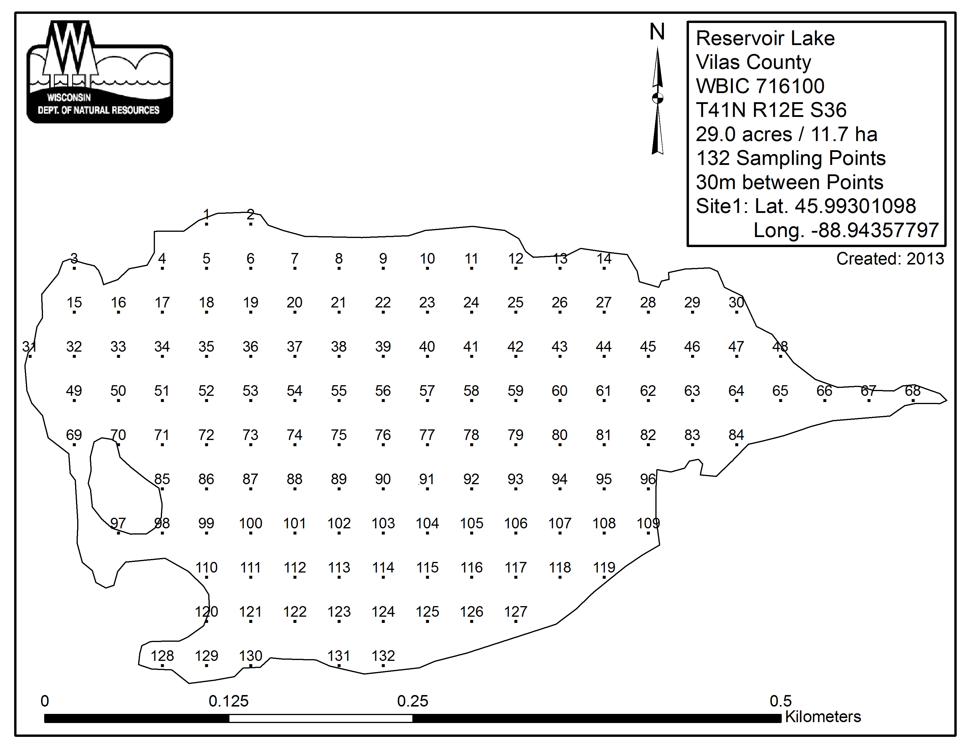 Reservoir Lake, Vilas County - Aquatic Plant Sampling Map (30 mpts)