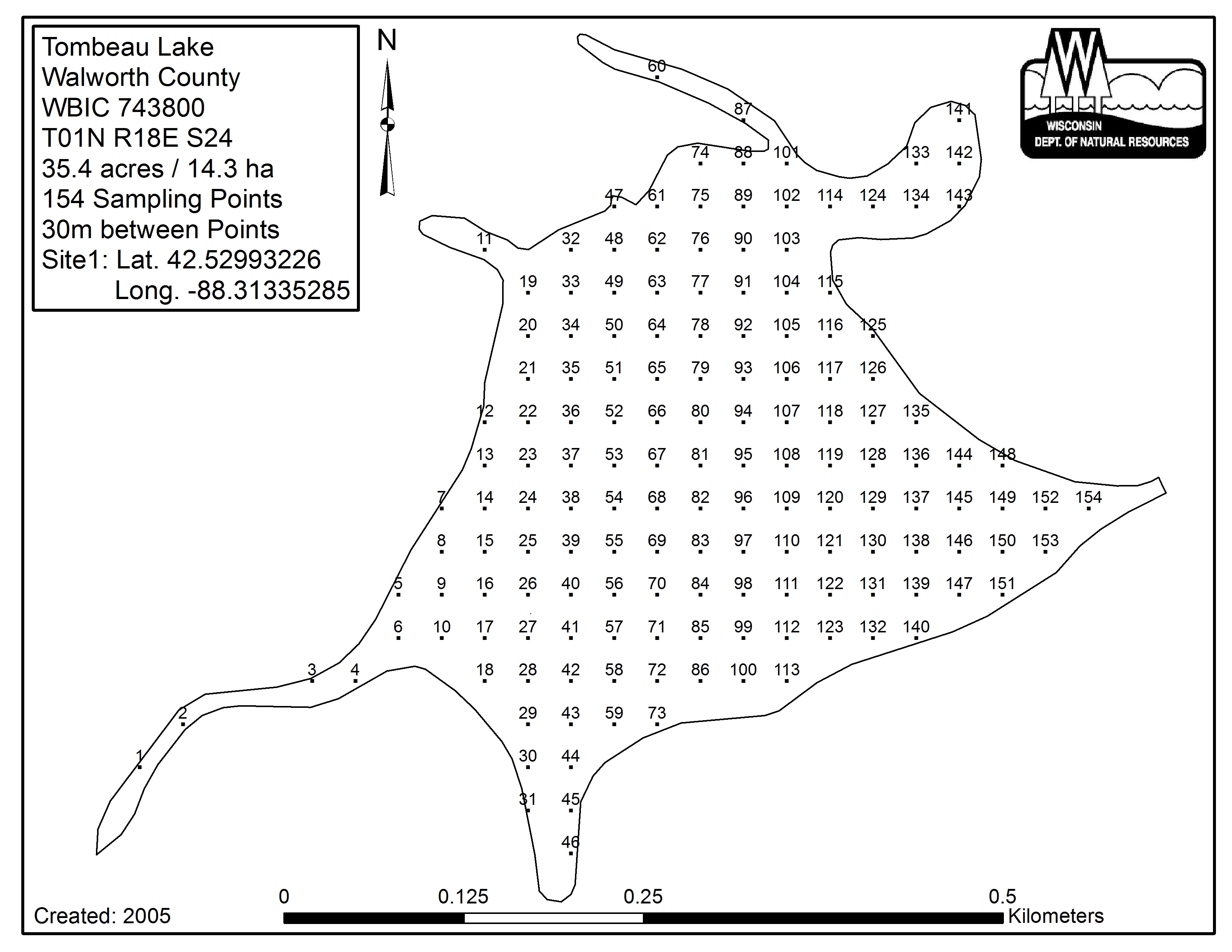 Tombeau Lake, Walworth County - Aquatic Plant Sampling Map (30 mpts)