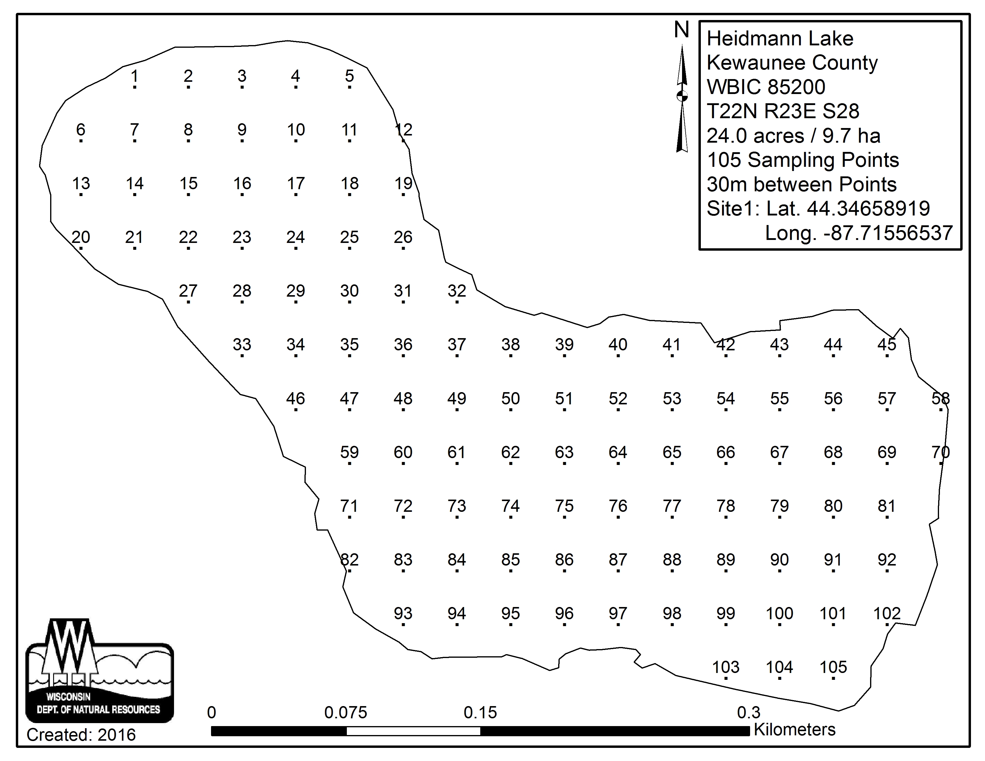Heidmann Lake, Kewaunee County - Aquatic Plant Sampling Map (30 mpts)