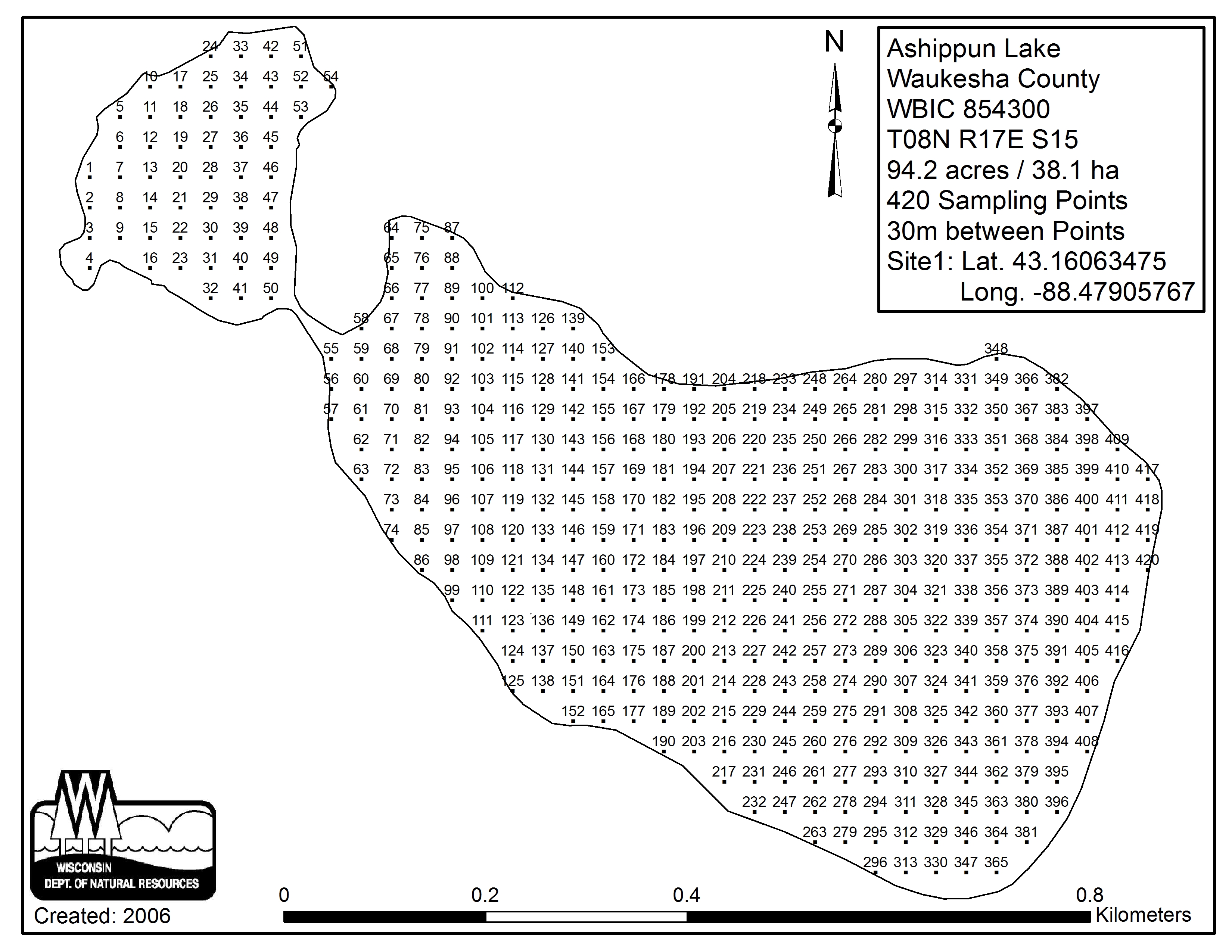 Ashippun Lake, Waukesha County - Aquatic Plant Sampling Map (30 mpts)