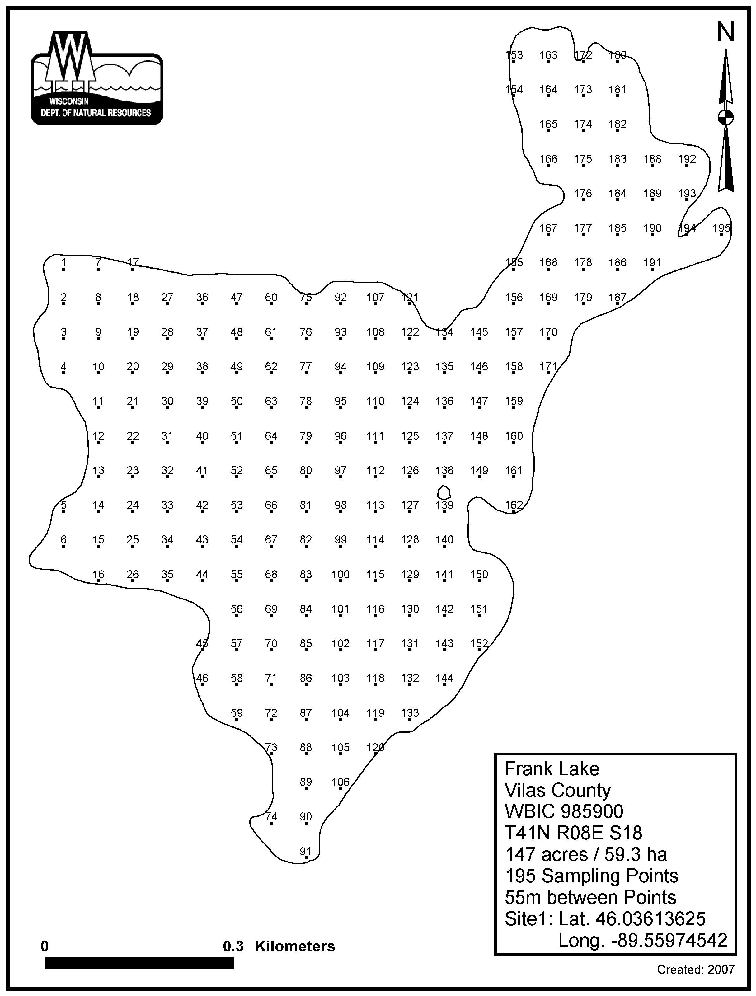 Frank Lake, Vilas County - Aquatic Plant Sampling Map (55 mpts)