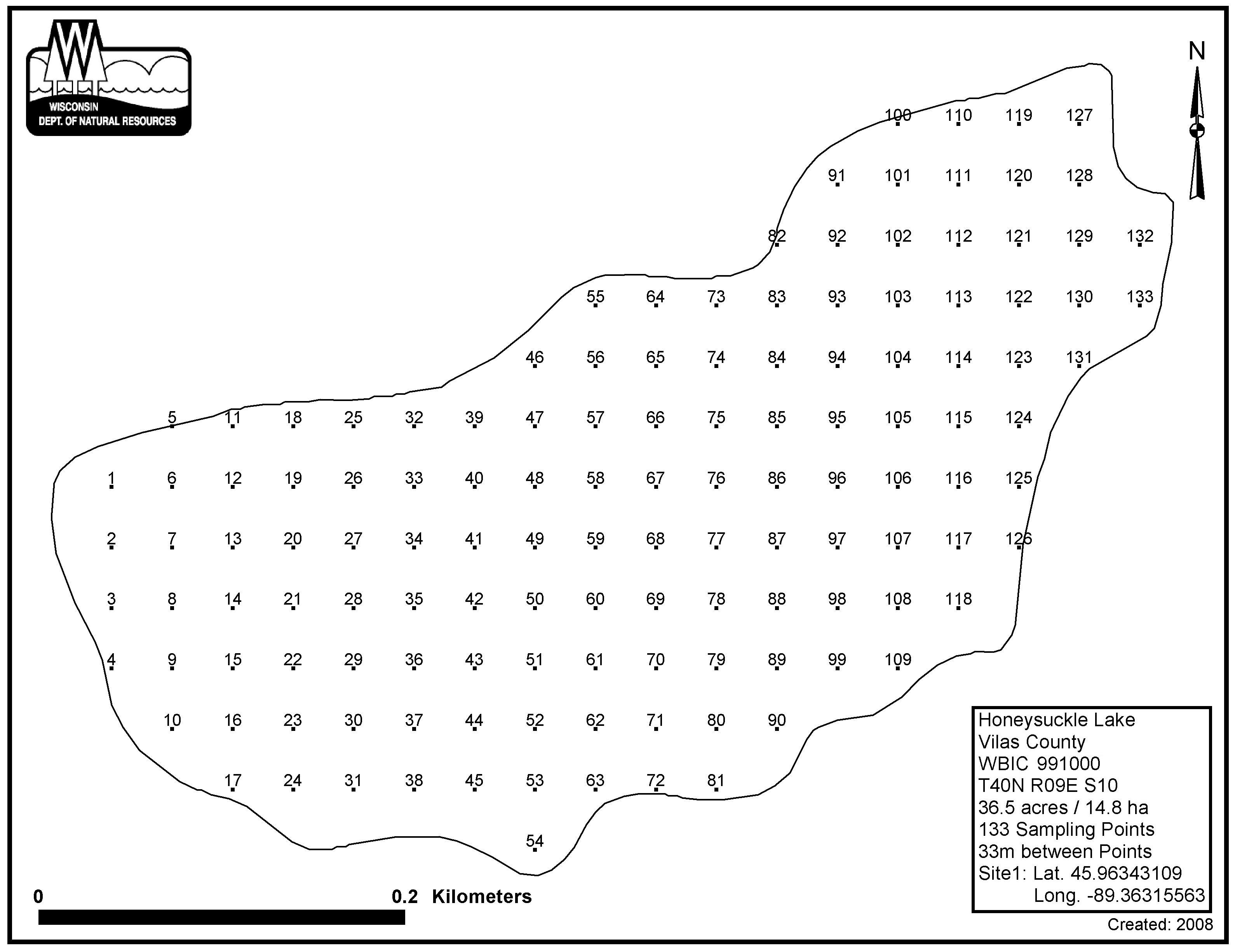 Honeysuckle Lake, Vilas County - Aquatic Plant Sampling Map (33 mpts)