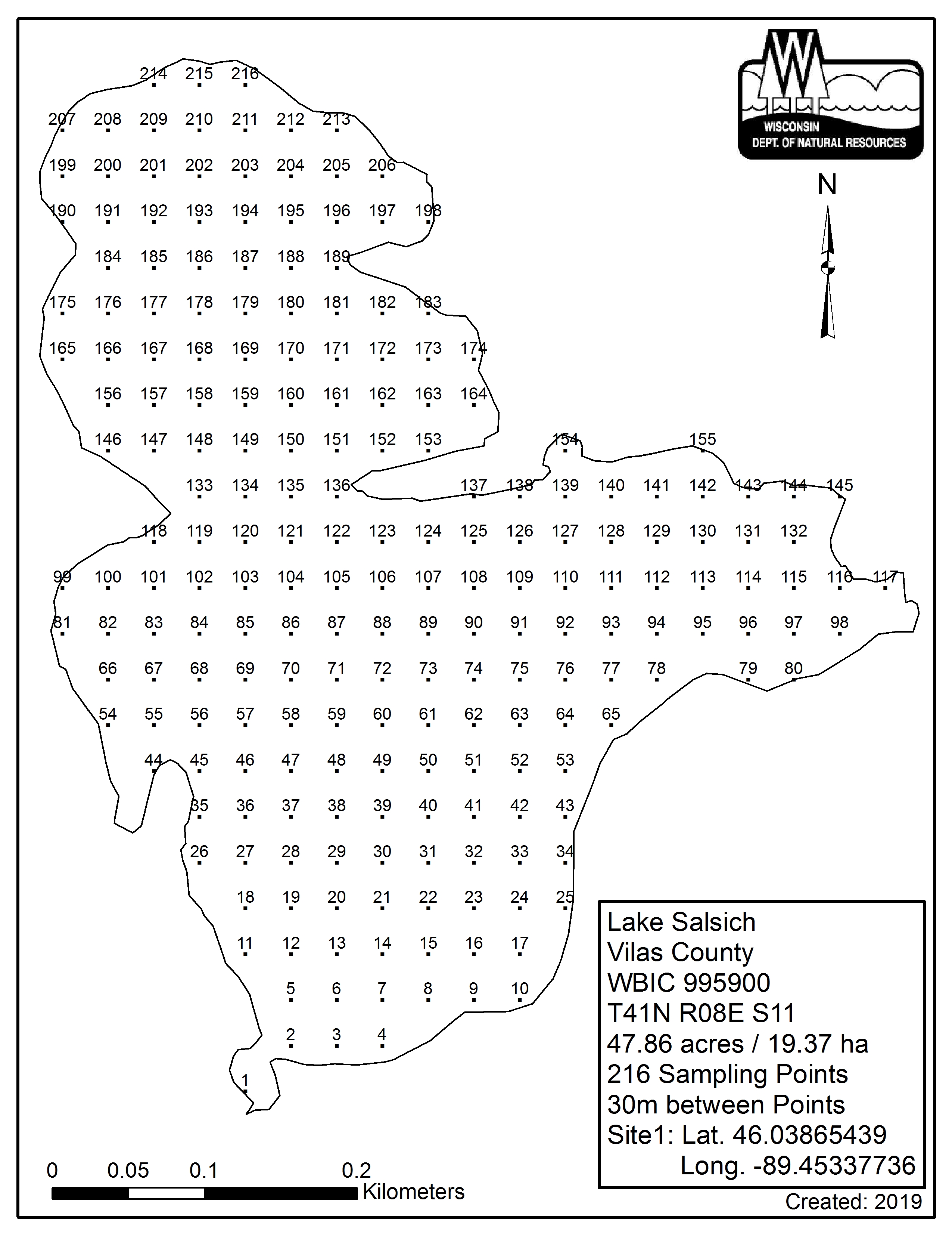 Lake Salsich, Vilas County - Aquatic Plant Sampling Map (30 mpts)